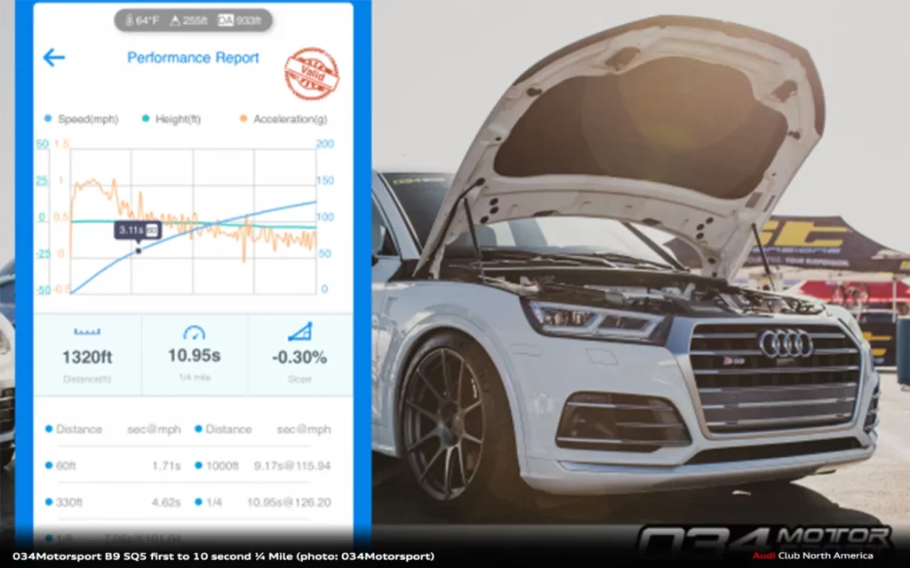 In 933ft DA and 64*F Weather, we broke the 10-second threshold with a 10.95 @ 126.20 MPH run! With this run, we locked in the World’s Quickest and Fastest recorded ¼ mile time for a B9 SQ5!