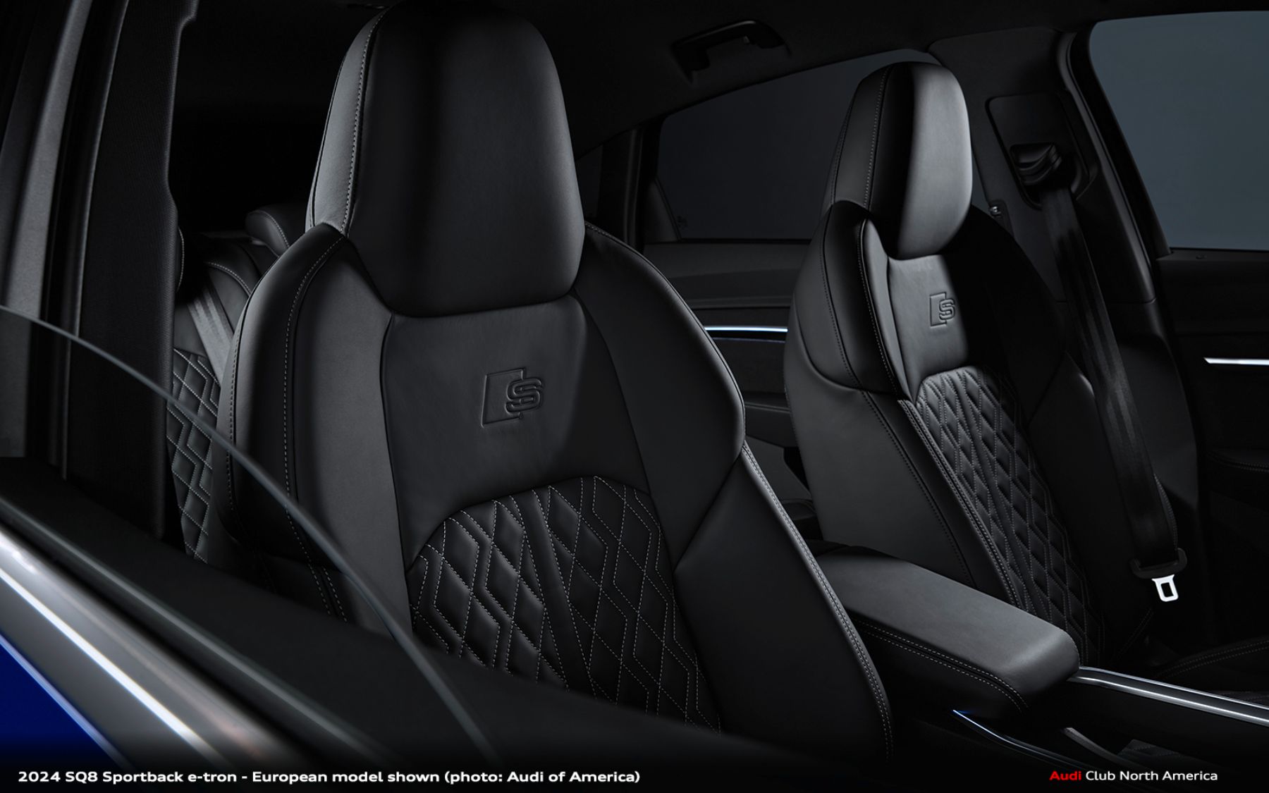 The SQ8 interior features standard 12-way adjustable power S-logo embossed front sport seats wrapped in Valcona leather with contrast diamond stitching, with available colors of Black, Rotor Gray, and Arras Red. Inside, SQ8 e-tron models are further differentiated with the addition of a performance themed Carbon square structure interior trim finish as standard, replacing the open pore wood offerings of the Q8 e-tron.
