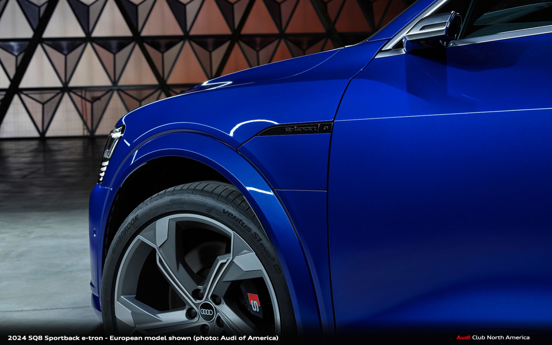 The 2024 Audi SQ8 e-tron and SQ8 Sportback e-tron are immediately identifiable by distinctive silver rocker-panel accents and aluminum-look exterior mirror housings, matched by similar treatments on the front fascia and rear diffuser. When compared to the 2024 Q8 e-tron, the SQ8 e-tron is also differentiated by flared fenders that widen the body overall by 1.5 inches (39 mm).