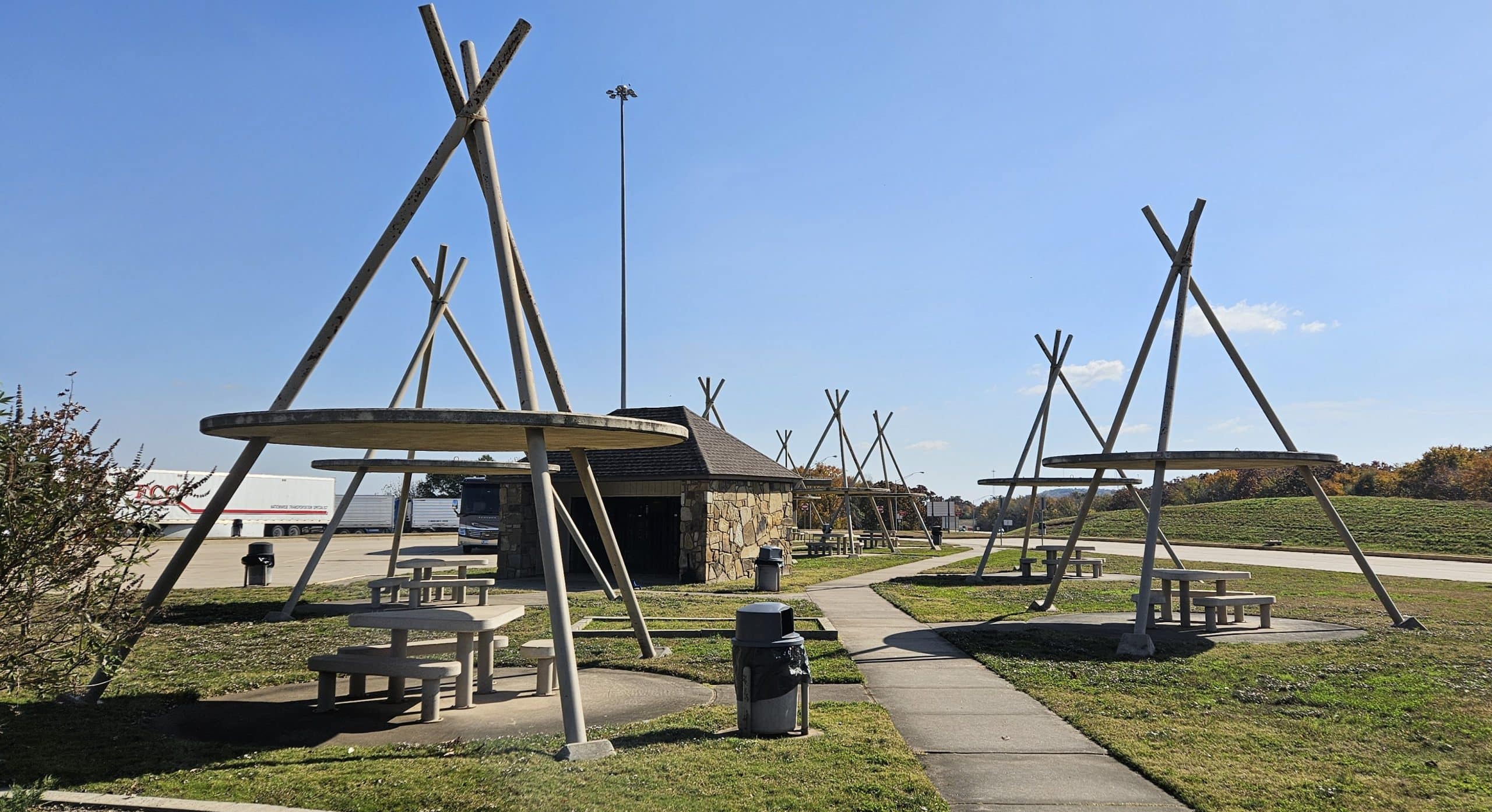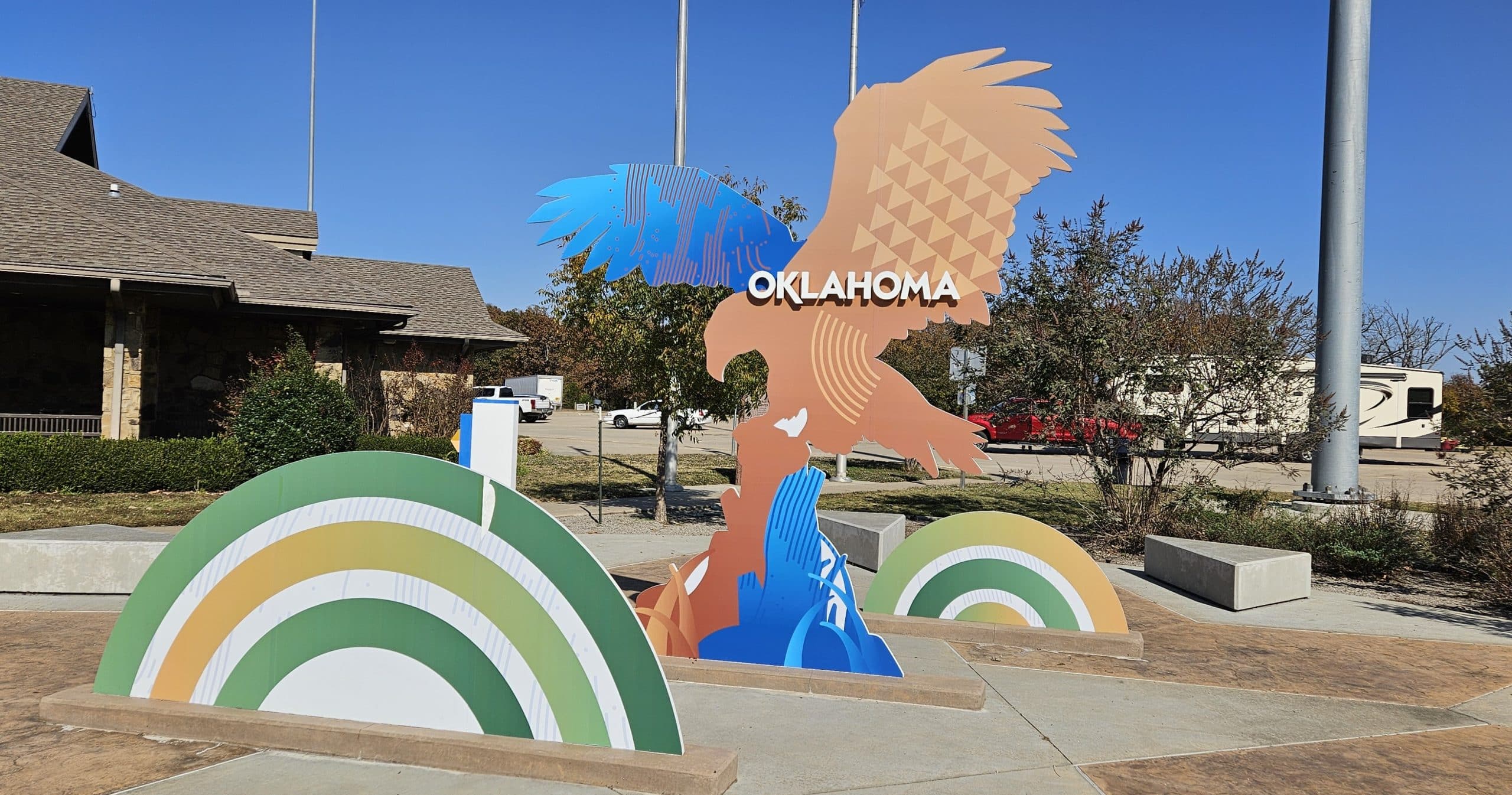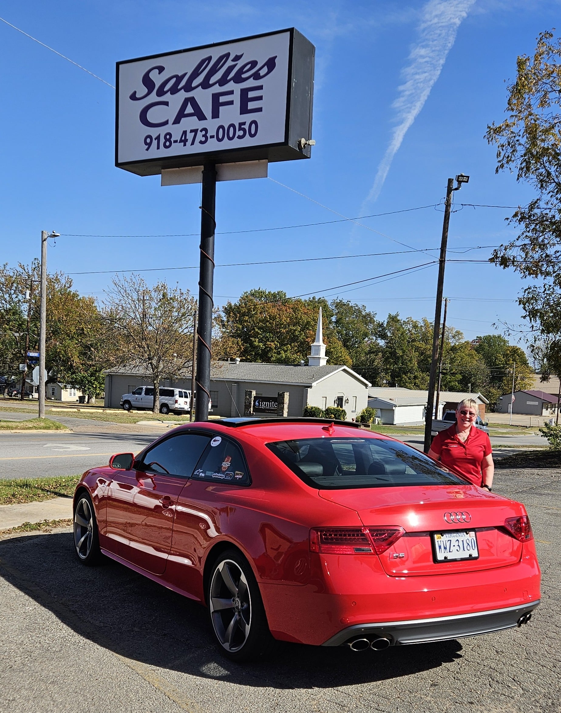 Our final day’s drive toward the Oklahoma border included some beautiful scenery. We noted that the trees were getting shorter and less numerous the closer we got to the border. Driving into OK the vista took on my preconceived notion of what the state would look like—flat and brown. The Oklahoma Tourism Information Center/rest stop off I-40 reminded us of the rest areas we saw in the Sioux country of South Dakota on our way to TT West in 2022. After three days we said good-bye to I-40 as we exited for lunch at Sallies Cafe in Checotah. I’d say it’s where the locals eat and give it four stars.