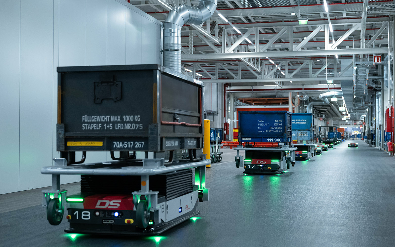 As part of Audi’s “360factory” production strategy, its supply chain relies on the smart, automated provision of materials. Automation roadmaps have been created for each location and are gradually becoming a reality. Neckarsulm was the first Audi site worldwide to put the freely navigating, driverless transport systems (DTS) into operation back in 2014. With the start of production of the new Audi A5, over 80 percent of the material volumes in the body shop are now provided automatically.