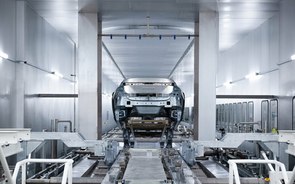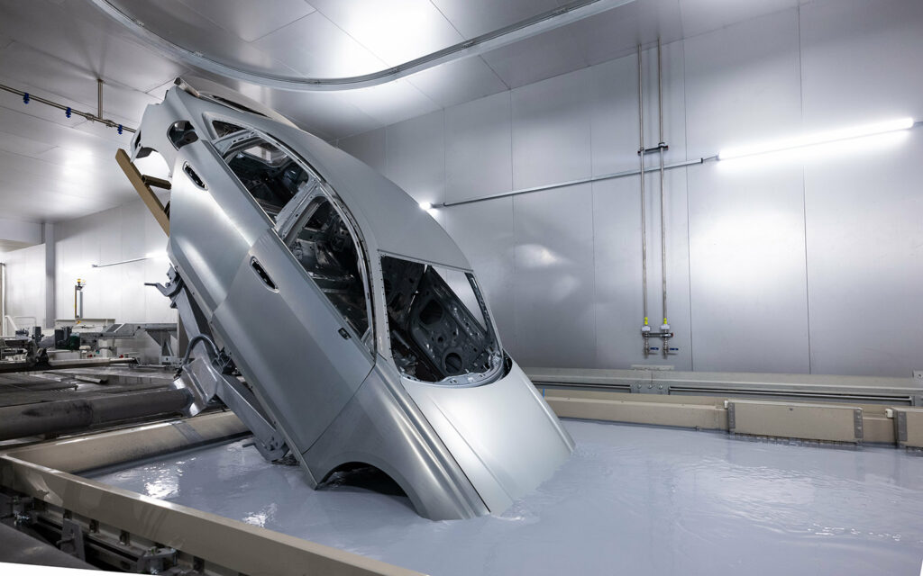 In Neckarsulm, Audi relies on modern and effective methods to prevent corrosion. Cathodic dip painting, for example, includes dipping and rotating the body upside down in the tank using a rotation process. This is more space-saving and thorough, as it avoids minimal air bubble formation and dirt deposits. A new, more energy-efficient process is also used for drying the cathodic dip coating. Instead of the previous external drying process, a so-called transverse drying process is now used. Air is blown into the interior, and the body is heated from the inside. In addition to being more energy efficient, the transverse dryer is better suited to future electric and hybrid vehicles and their strengthened floor assemblies.