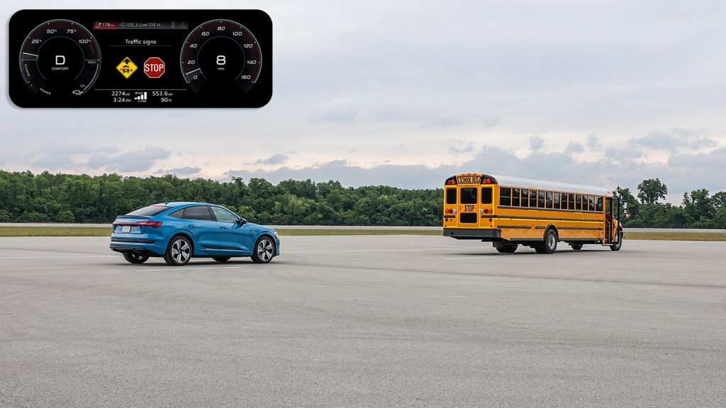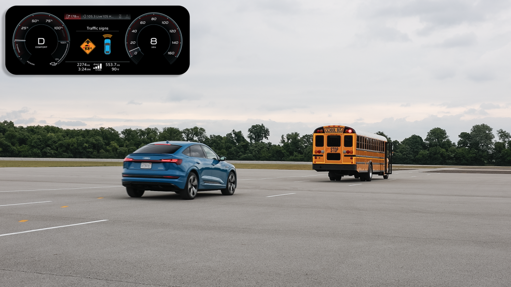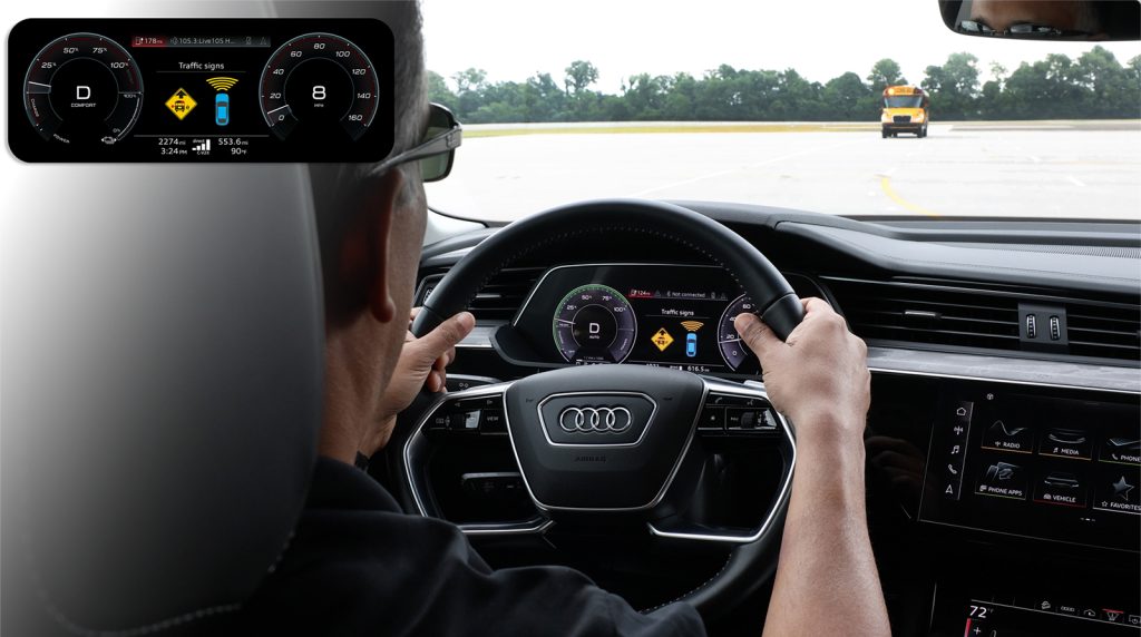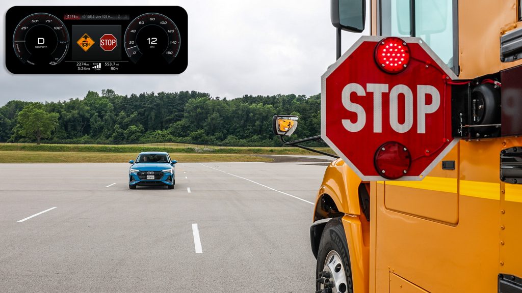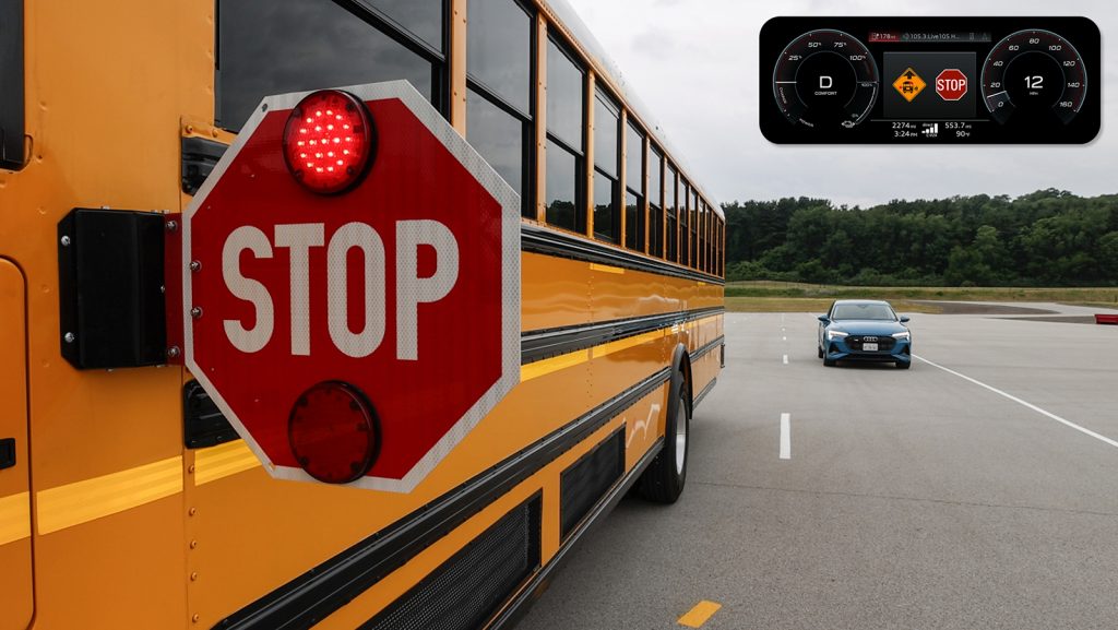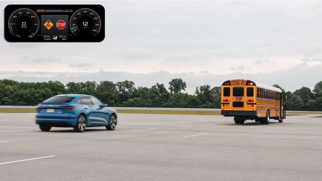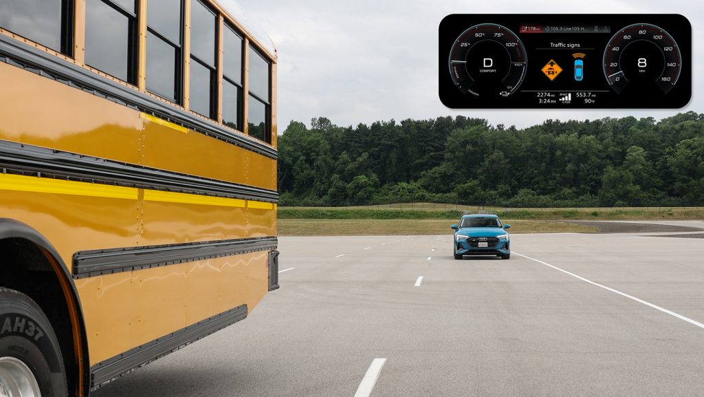 With C-V2X direct communications technology, the driver receives a direct message alert in the cockpit of the Audi vehicle providing an early notification of an approaching school bus stop situation. The alert is provided even when the school bus is not visible to the driver such as around a corner, over a hill or if the driver’s view is blocked by other vehicles. Conversely, the school bus driver receives an alert of the approaching vehicle during a school bus stop as well as a warning if a vehicle is potentially approaching too quickly to be able to stop in time. This allows the school bus driver to take actions such as to not open the door or to alert the children to remain on the curb. The end result is that it enables drivers to have additional time to prepare or react and contributes to safer transportation for school children.