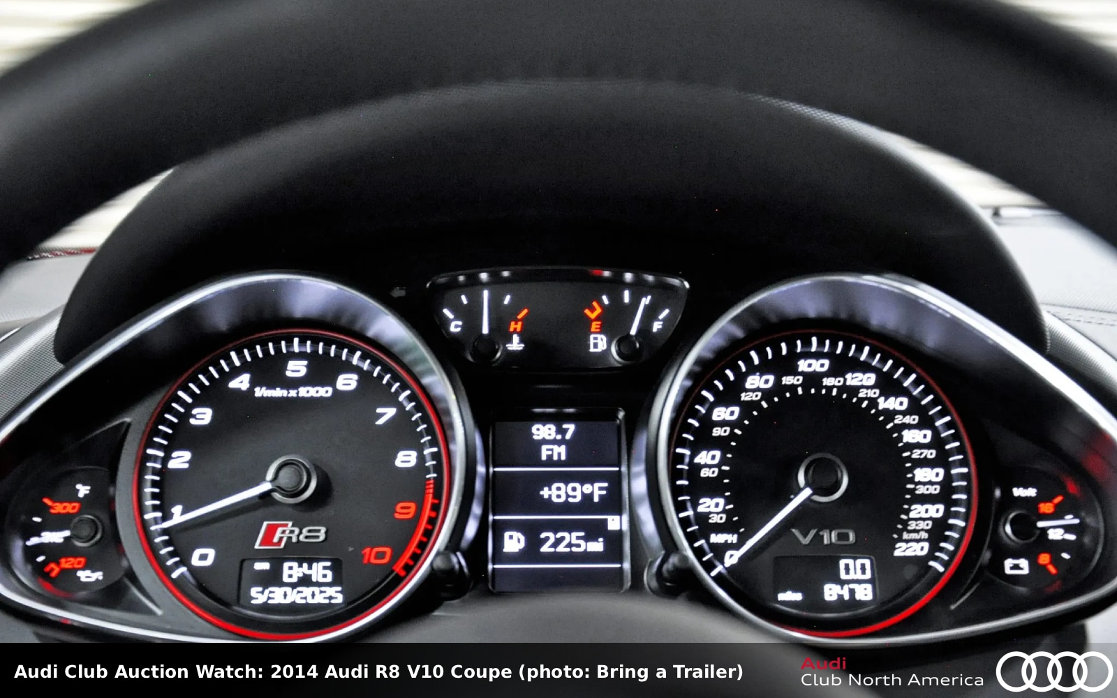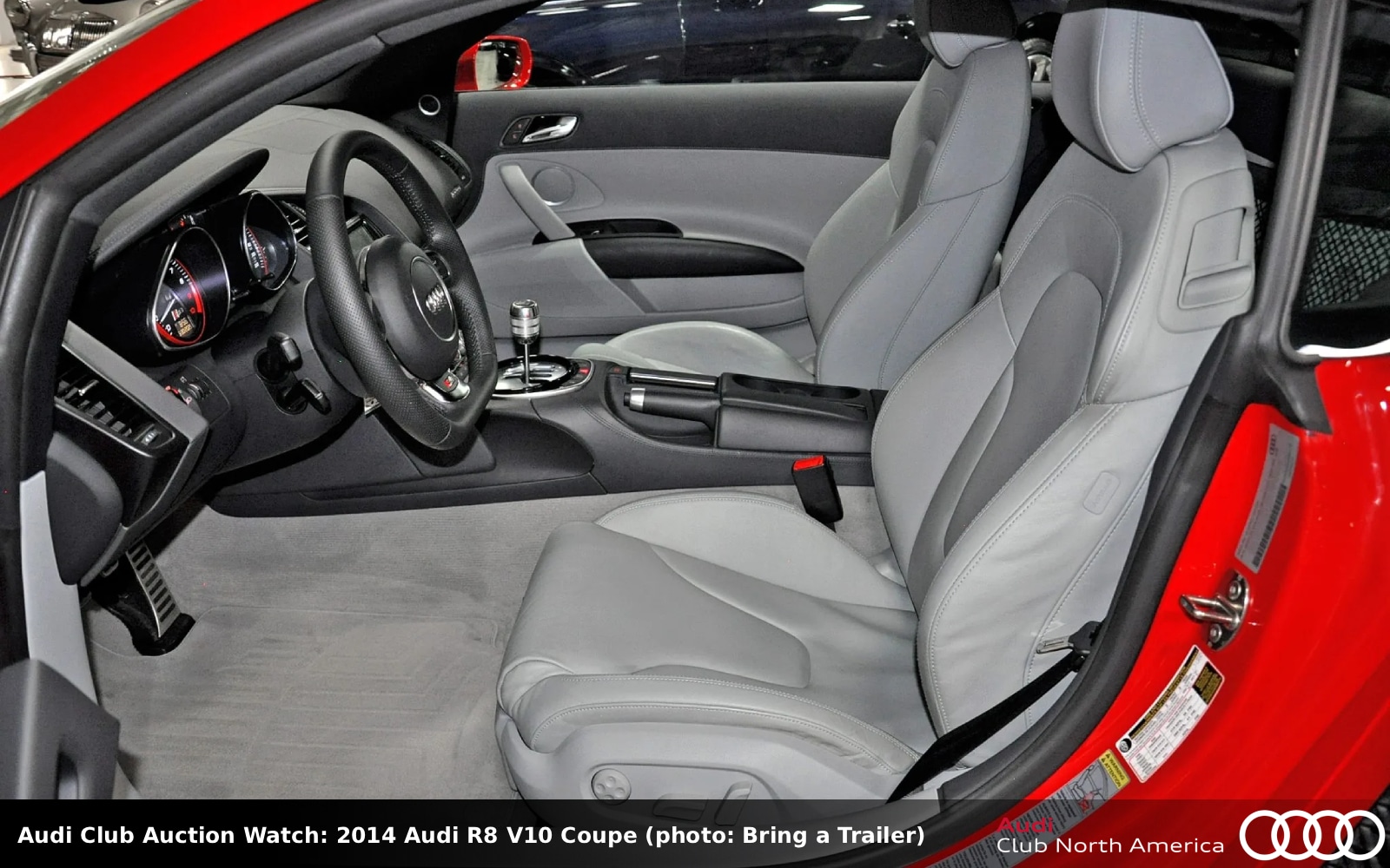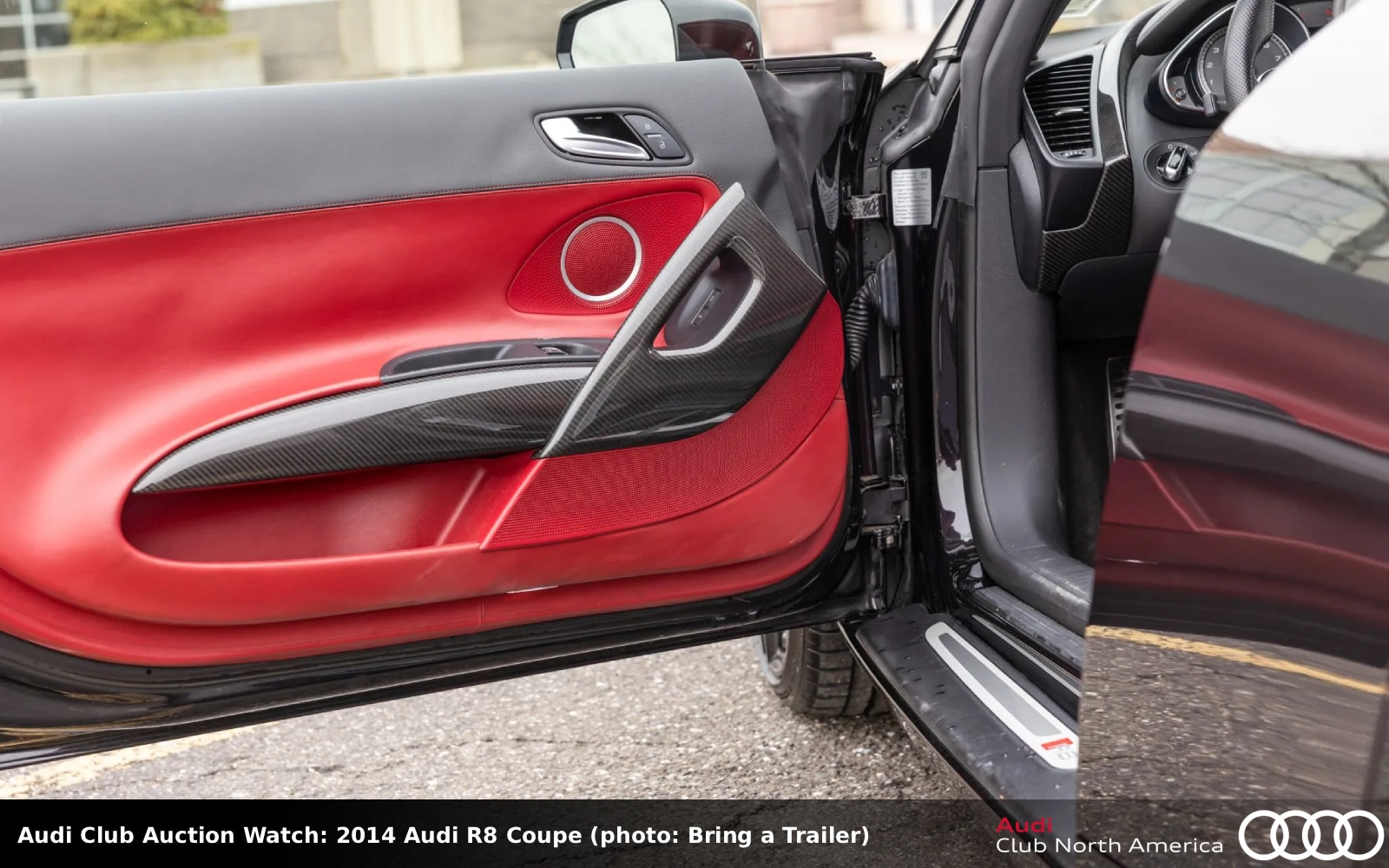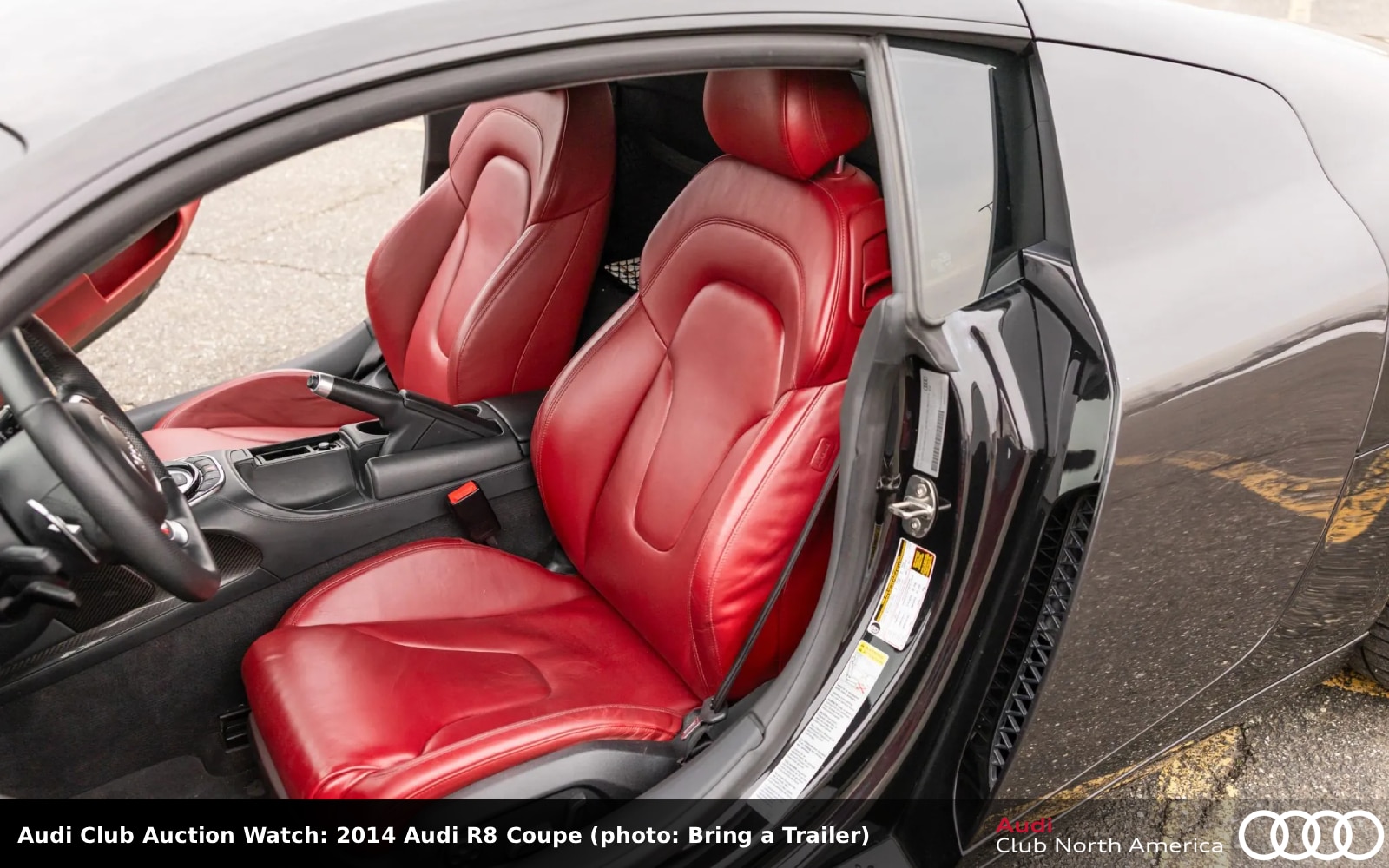 Bid quickly, auction end late PM today!  This Brilliant Red Type 42 with carbon fiber Sigma side blades is the lone Brilliant Red MY14 example with a manual transmission. The 19″ Y-design wheels are suspended by Audi Magnetic Ride magnetorheological dampers. The Titanium Gray interior has leather seats, two-tone door panels, Audi Parking System Plus with a rearview camera, and B&O sound. The 5.2LV10 (525HP/391 lb-ft) resides in a carbon fiber-lined engine bay and spins the aforementioned 6-speed manual. Carfax reports only two previous owners (one long term), no accidents/damage, but a very thin service history. No doubt those are still the original tires as well.