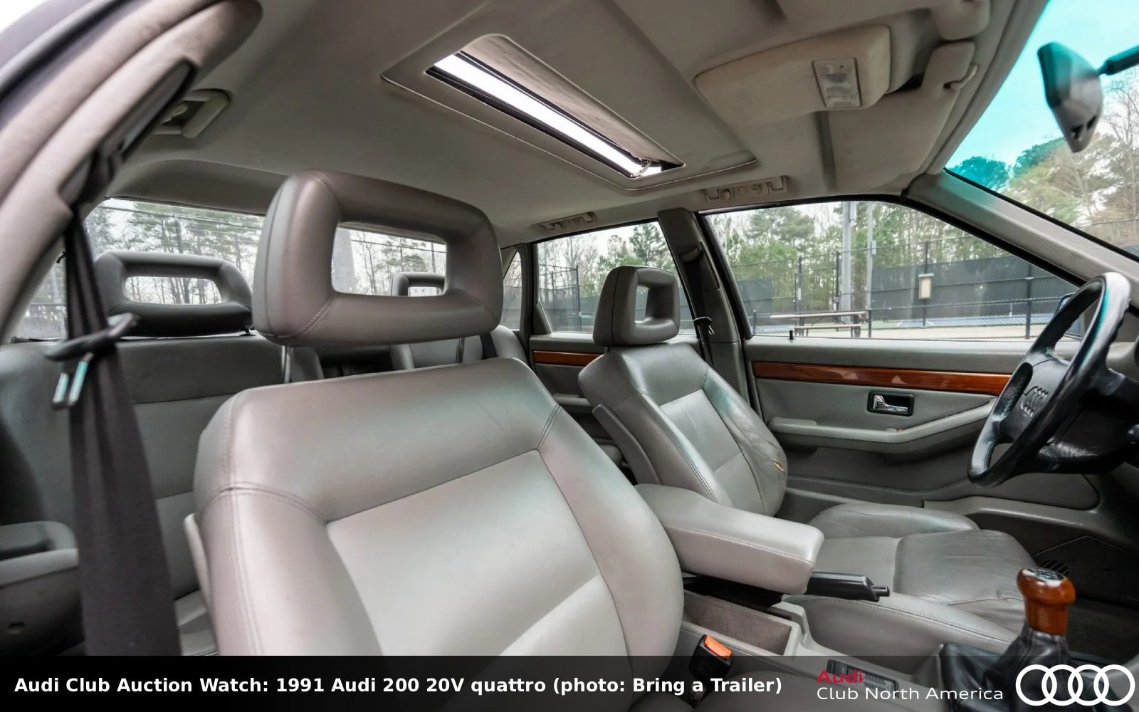 This Lago Blue metallic (repainted due to fading) classic sedan 1 of about 350 examples imported to the U.S. market for MY1991. The turbocharged 20-valve 2.2L I5, factory rated at 217HP/228 lb-ft when new, is what sets it apart. A 5-speed manual transaxle and a rear differential lock engaged via a button in the center console plus quattro complete the drivetrain. Please read the listing for service done by the seller since their purchase. The interior has Platinum leather Sport seats, wood trim, a replacement headliner, cruise control, a power sunroof, and an Alpine stereo. The car still has its “UFO” front brakes with inside-mounted calipers.