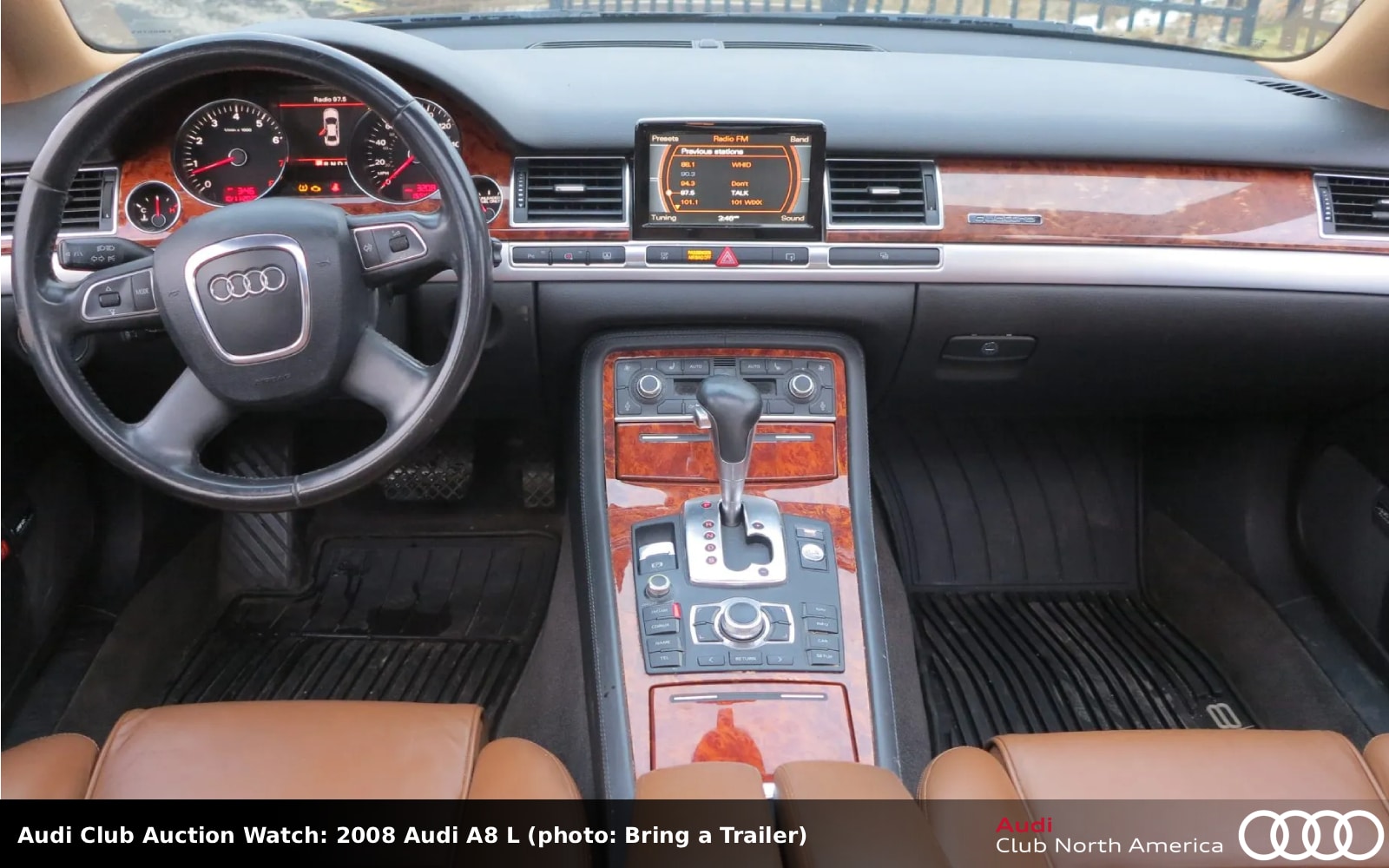 No Reserve. That dark exterior color is Night Blue pearl and it’s over a contrasting Amaretto interior with Valcona leather seats heated front and rear, amber sycamore wood trim, and a stereo with Bose sound and a glovebox-mounted CD changer. The 4.2L V8, factory rated at 350HP/325 lb-ft when new, turns a 6-speed Tiptronic with a Torsen center diff and quattro. Carfax reports four previous owners, very little service history, but no accidents, damage, or open recalls. The TPMS light is illuminated, the seller states at least one TPMS sensor does not read accurately.