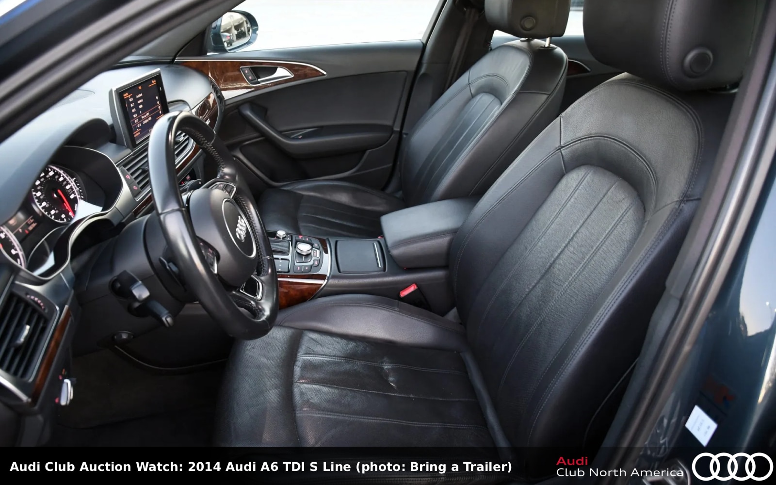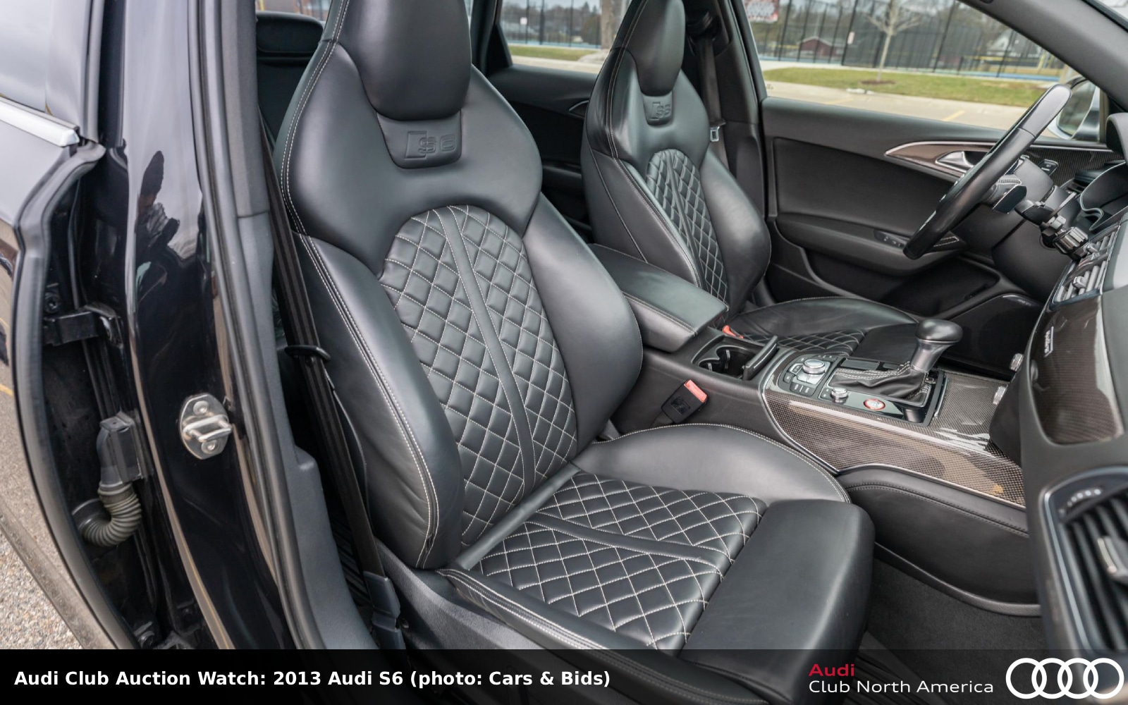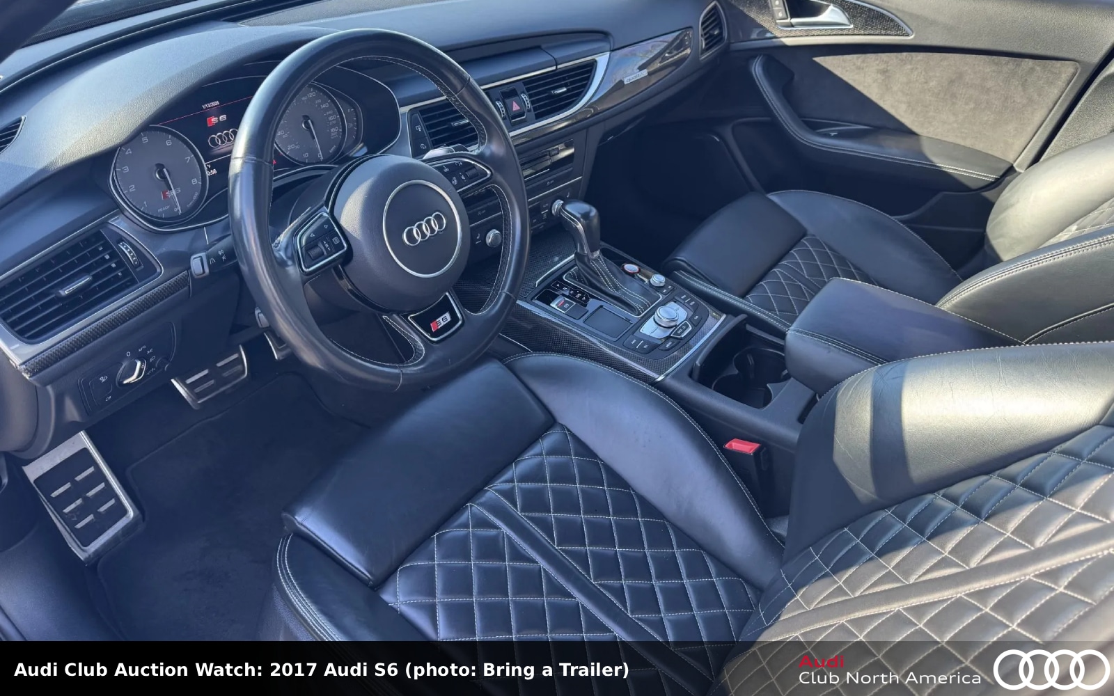 Another 6-series example now—it’s twin-turbo 4.0L V8 is enhanced with Audi Club sponsor APR’s Stage 1 ECU tune. The power flows to a 7-speed S tronic, Sport diff and quattro. The exterior is Tornado Gray metallic with Black Optics; the black interior has Valcona leather seats with silver stitching, Carbon Atlas trim, a Driver Assistance Package, a top-view camera system, and Audi Adaptive Cruise Control with Stop & Go. It also has an S6 Sport package. Carfax reports three previous owners and no accidents/damage.
