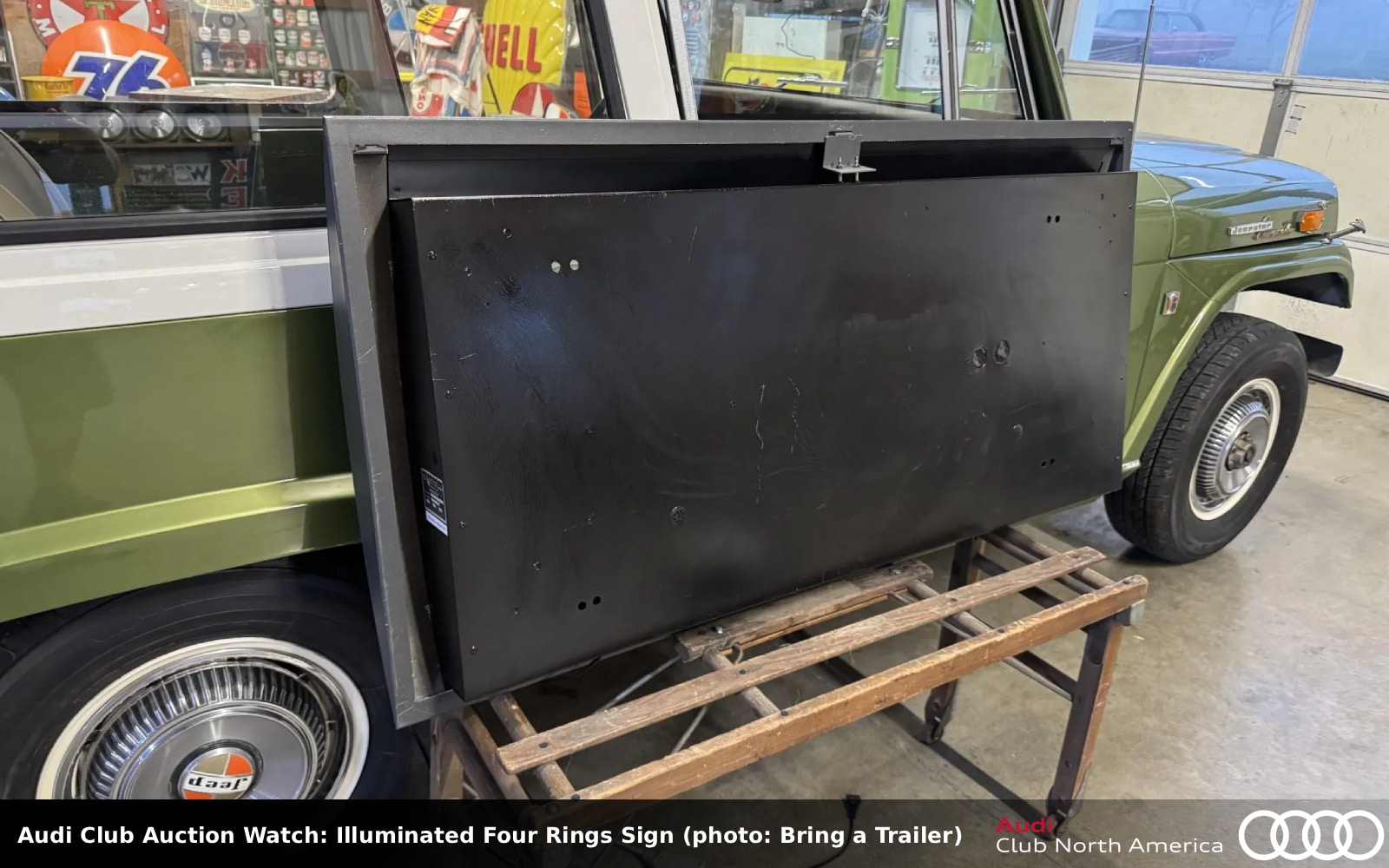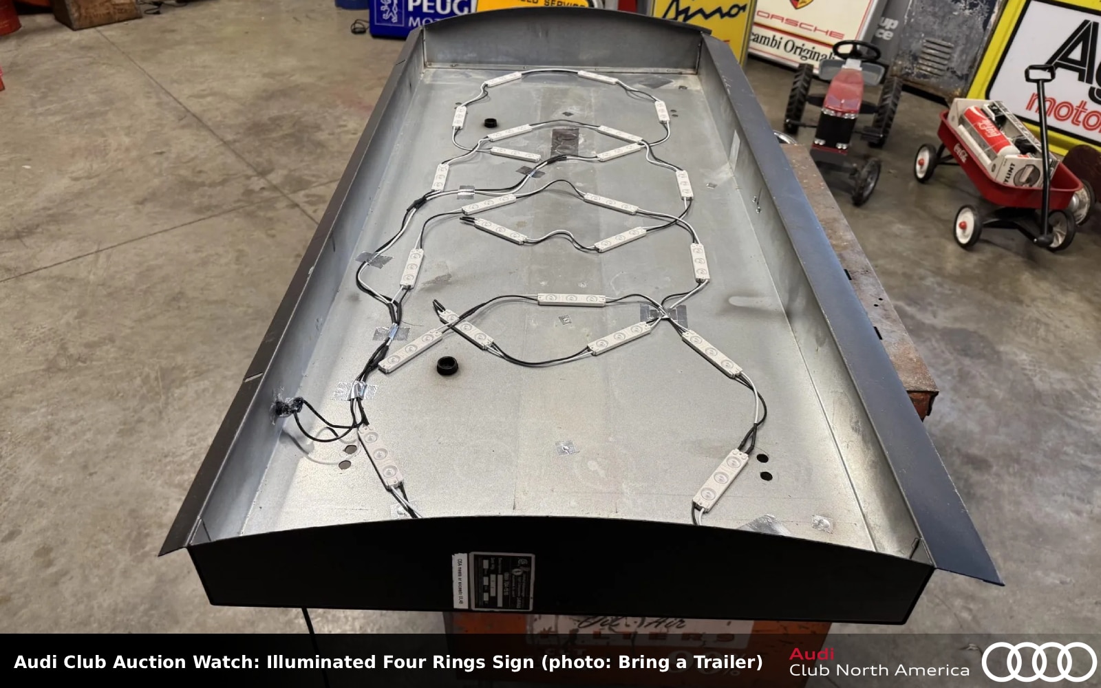 Bid quickly, auction ends mid-PM today! No Reserve. Here’s another Audi four rings sign, the logo which dates back to the merger of Audi, DKW, Horch, and Wanderer in 1932. This one is about 55″ wide by 27.5″ tall and 6″ deep; it weighs about 30 pounds. It was retrofitted by the selling dealer with 120-volt LED fixtures for illumination, and the replacement power cord has an inline on/off switch as well as a US-style wall plug. There are pre-drilled mounting holes on the back and the panel on the back places it about 3″ off the wall when hung. It can also be displayed freestanding.