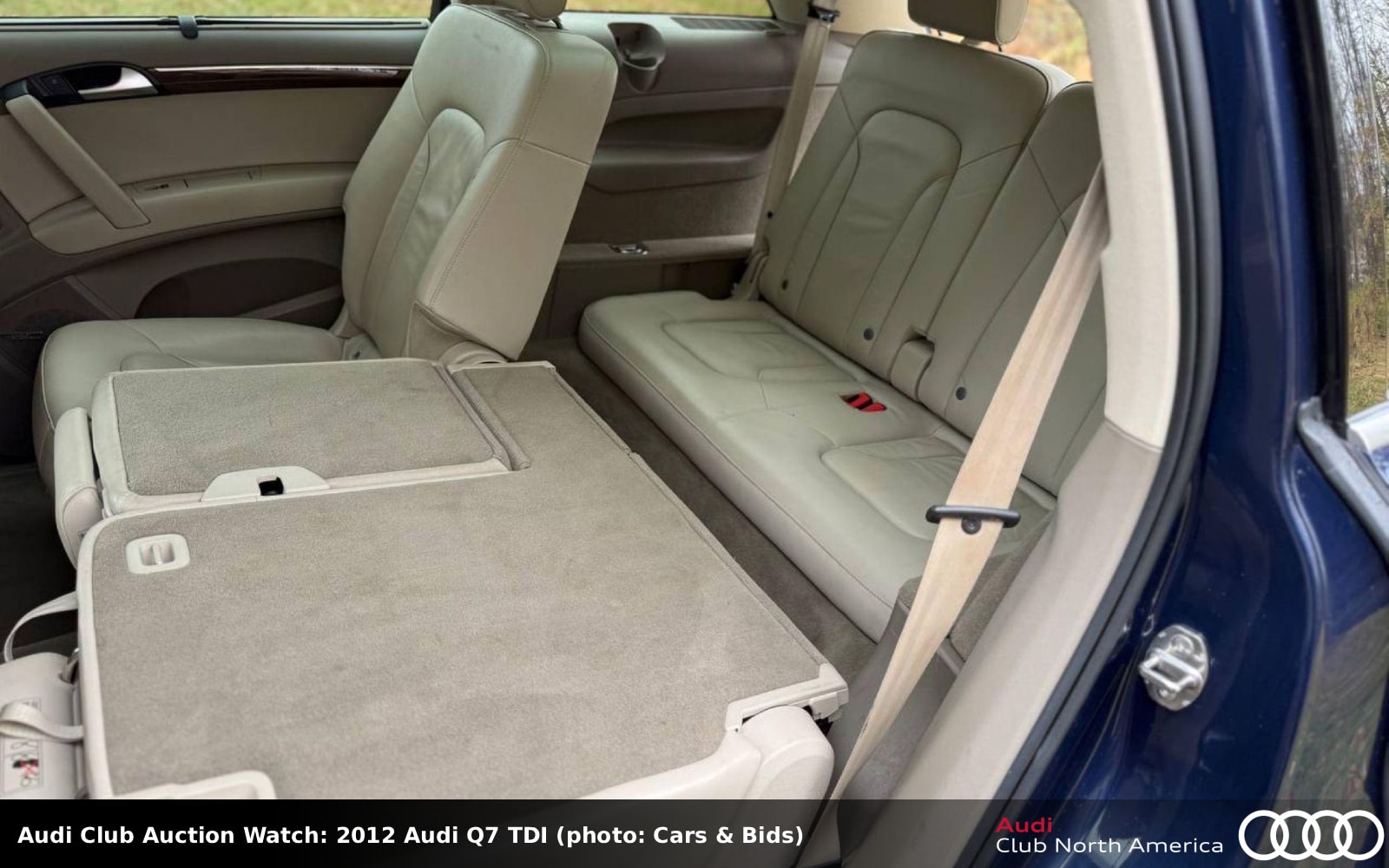 Bid quickly, auction ends late PM today! No Reserve. This full-size SUV is painted Mugello Blue pearl and has a contrasting Cardamom Beige interior with Premium Plus, Warm and Cold Weather packages. Also inside are three rows of leather seating under a panoramic sunroof and natural walnut wood trim. The 3.0L turbodiesel V6, rated at 225HP/406 lb-ft when new, bolts to an 8-speed Tiptronic. Carfax reports this is a one-owner car before subsequent dealer acquisitions and no accidents/damage.