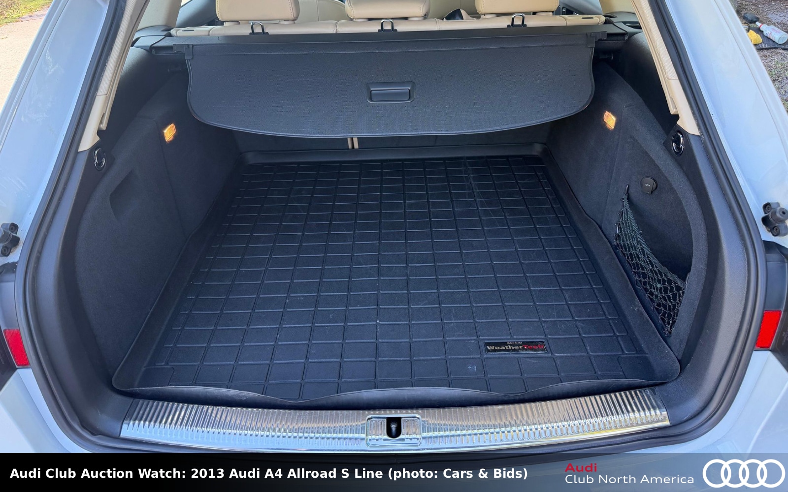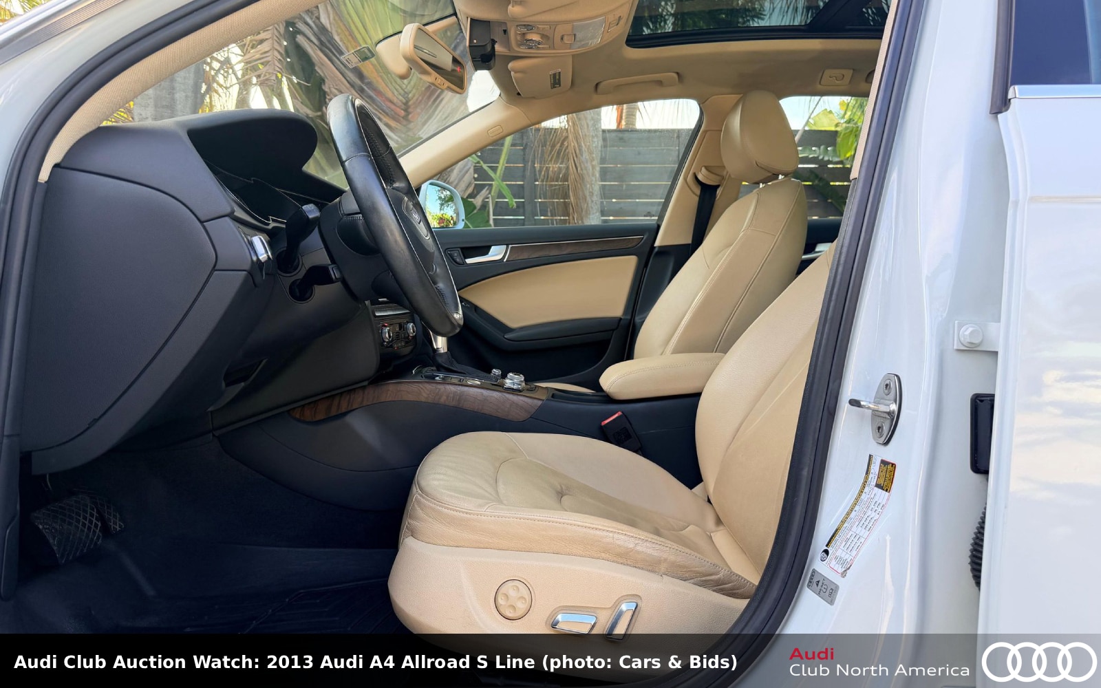 The Glacier White metallic long roof has a complimentary Velvet Beige interior with leather seats, wood trim, Premium Plus and Audi MMI Navigation Plus packages, a panorama sunroof, and WeatherTech floor and cargo mats. The 2.0L I4 (220HP/258 lb-ft) bolts to an 8-speed Tiptronic. Carfax reports one previous owner before dealer acquisition and a rear-end collision with another motor vehicle in February 2013 but no further details.