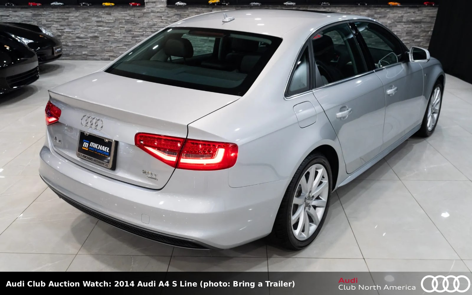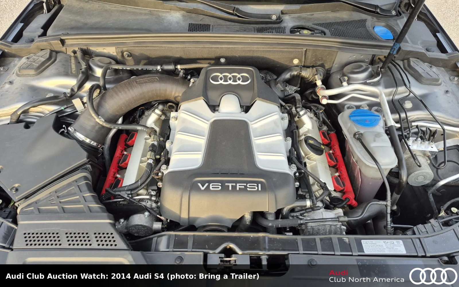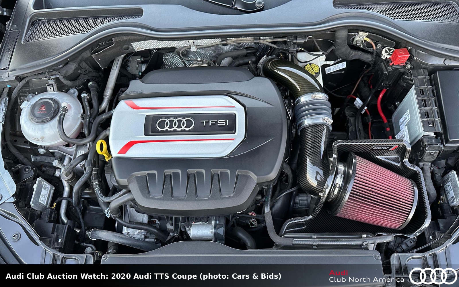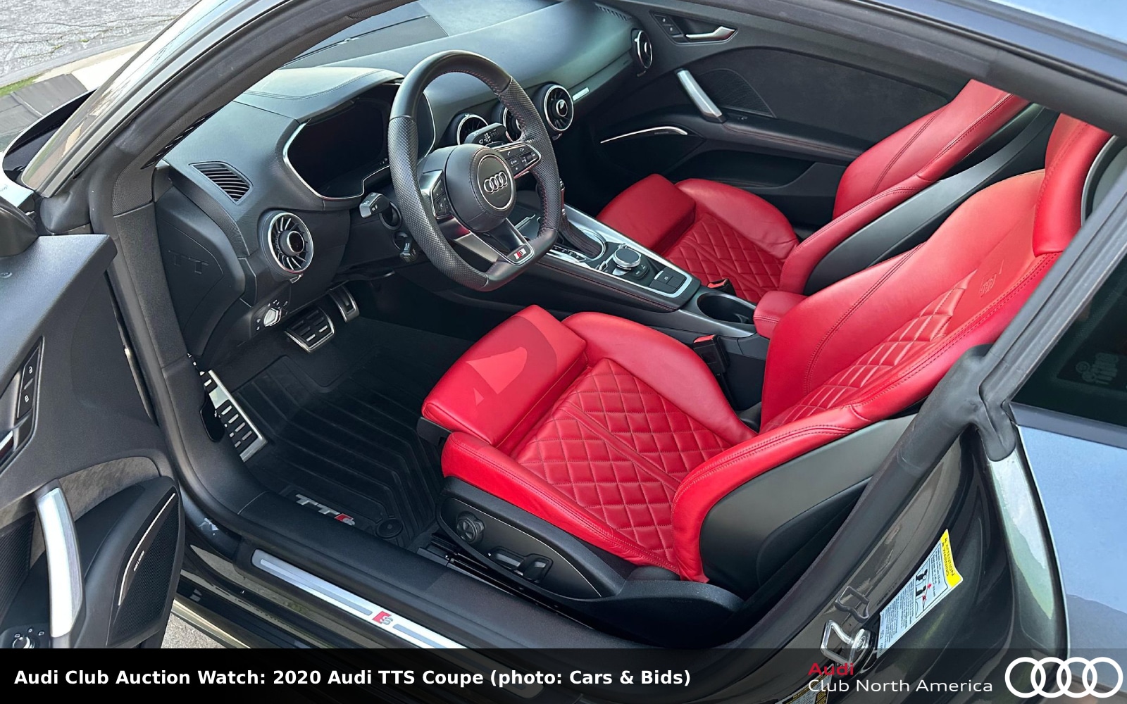 The Daytona Gray pearl exterior covers an interior with bright Express Red Nappa leather seats and B&O sound. The turbocharged 2.0L I4 is enhanced by Audi Club sponsor APR’s carbon fiber cold air intake and aluminum turbo inlet pipe, it also has a 034Motorsport turbo muffler and resonator delete kit. A 7-speed S tronic and Haldex drive complete the drivetrain. It rolls on 19” Rotiform SGN wheels. Carfax reports three previous owners and no accidents/damage.