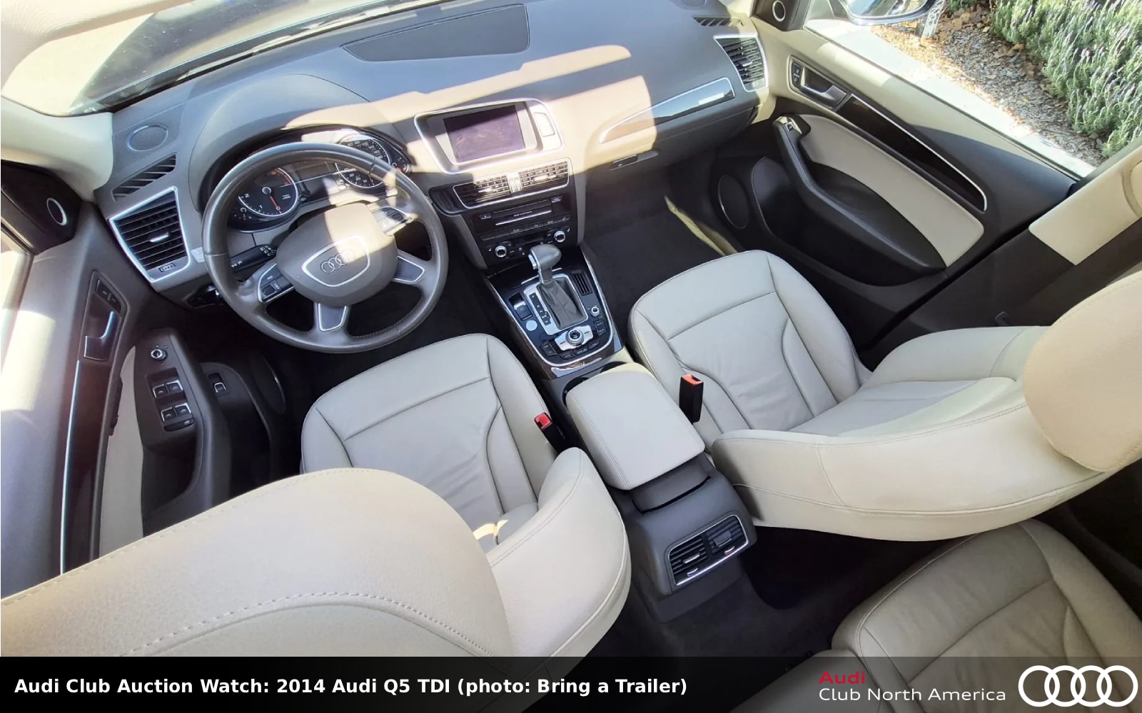 While this SUV looks black it’s actually Moonlight Blue metallic and that’s over a contrasting Pistachio Beige interior. Inside are leather seats, wood trim, Audi MMI Navigation Plus package, Audi Parking System Plus with a rearview camera, a panoramic sunroof, and B&O sound. It also has an OEM tow hitch. The turbodiesel 3.0L V6 (240HP/428 lb-ft) pairs with an 8-speed Tiptronic. Carfax reports minor to moderate damage to the front and right front in November 2017 and the seller notes that the hood and fenders were replaced.