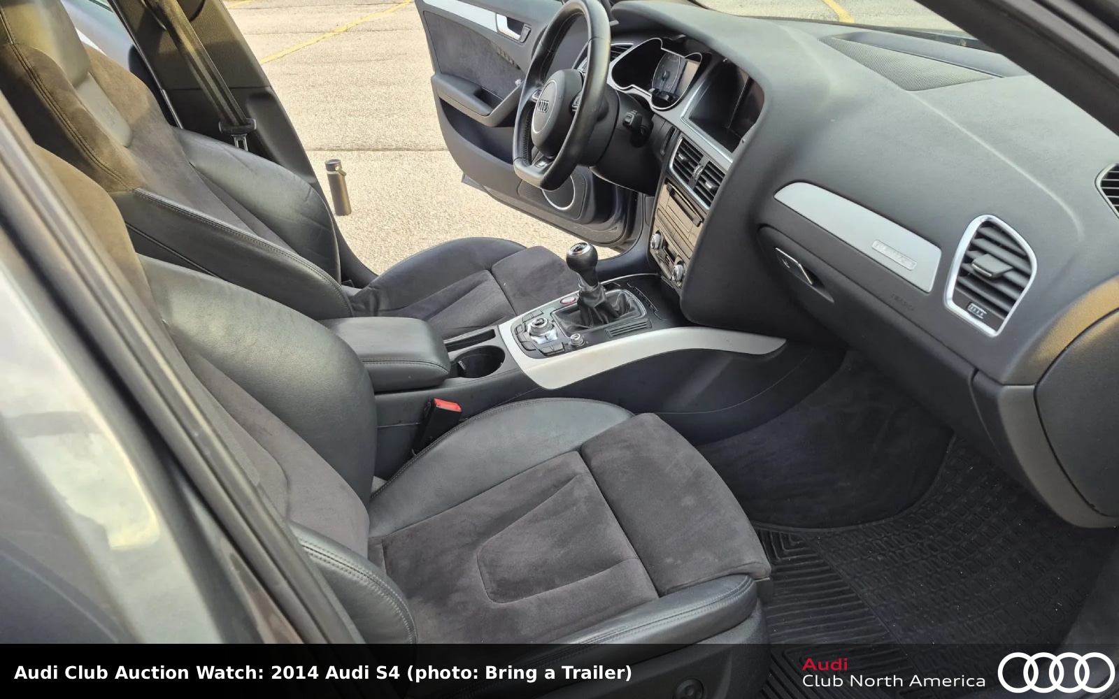 No Reserve. The sedan’s exterior is Monsoon Gray metallic with a Black Optic package. The black interior has leather/Alcantara seats, brushed aluminum trim, B&O sound, and the seller notes faults related to the Audi MMI Navigation Plus infotainment system and Audi Side Assist. The 3.0L supercharged V6 now inhales via an AWE Tuning intake, runs Audi Club sponsor APR’s Stage 2 ECU tune, and exhales into a STaSIS exhaust. Please read the listing for items serviced in 2024 and 2025. A replacement 6-speed manual, Sport diff and quattro complete the drivetrain. Carfax reports minor damage to the rear and right rear of the car in August 2016. There is a ding on the right fender and right quarter panel, as well as a dent above the left exhaust outlets.