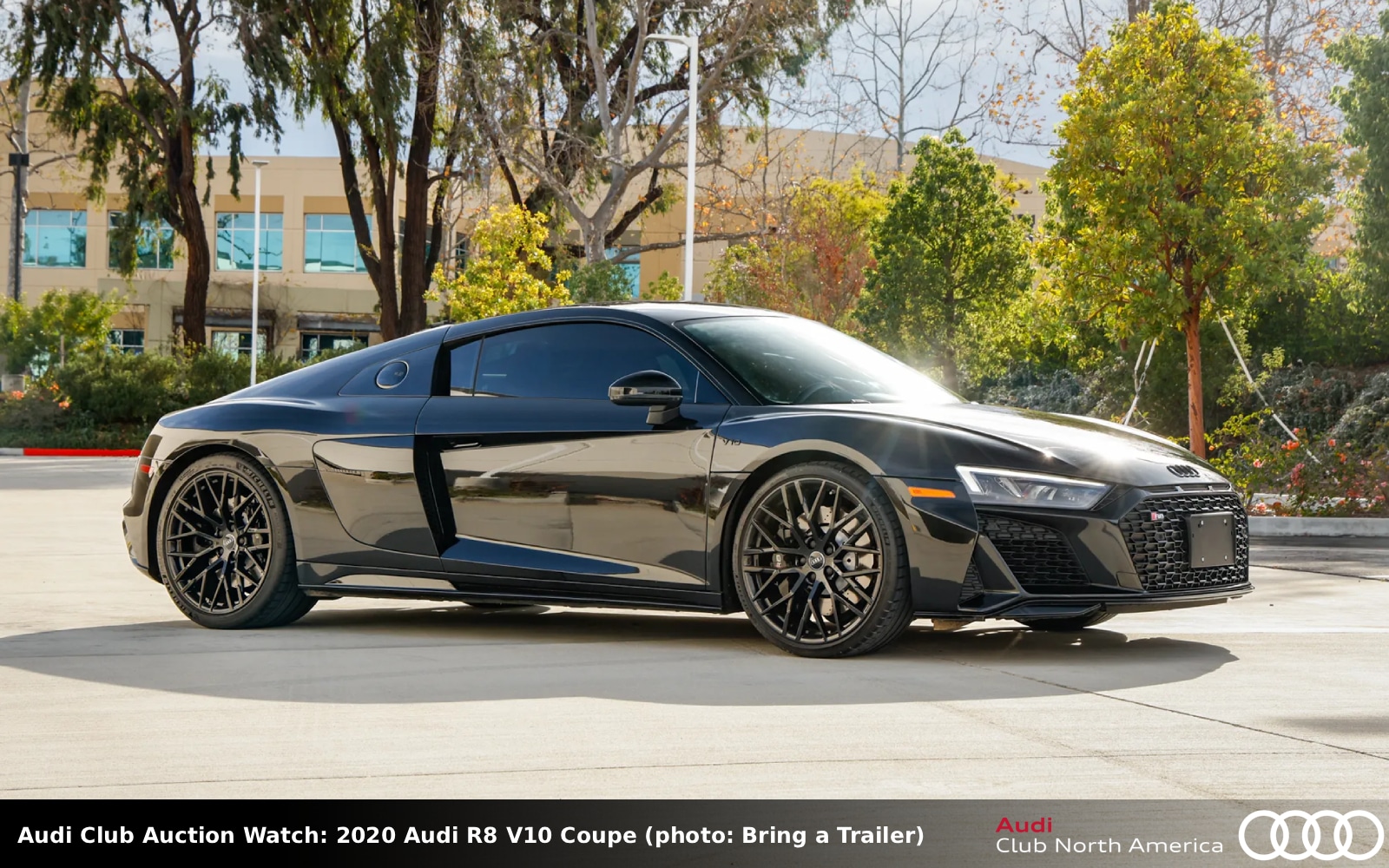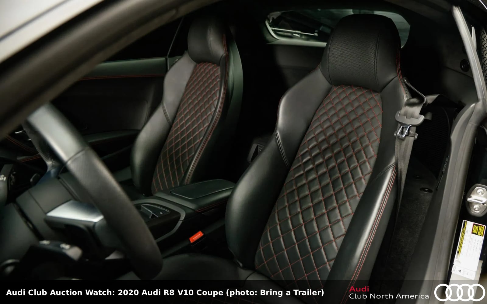 Bid quickly, auction ends mid-PM today! This Mythos Black metallic coupe is looking for only its second home. The black interior has a Diamond Stitch (in red) Full Leather package that includes an Alcantara headliner, Anthracite aluminum trim, and B&O sound. It rolls on the optional 20” Wheel package. The 5.2L V10, factory rated at 562HP/406 lb-ft, pairs well with a 7-speed S tronic. Carfax reports no accidents/damage and an excellent service history.