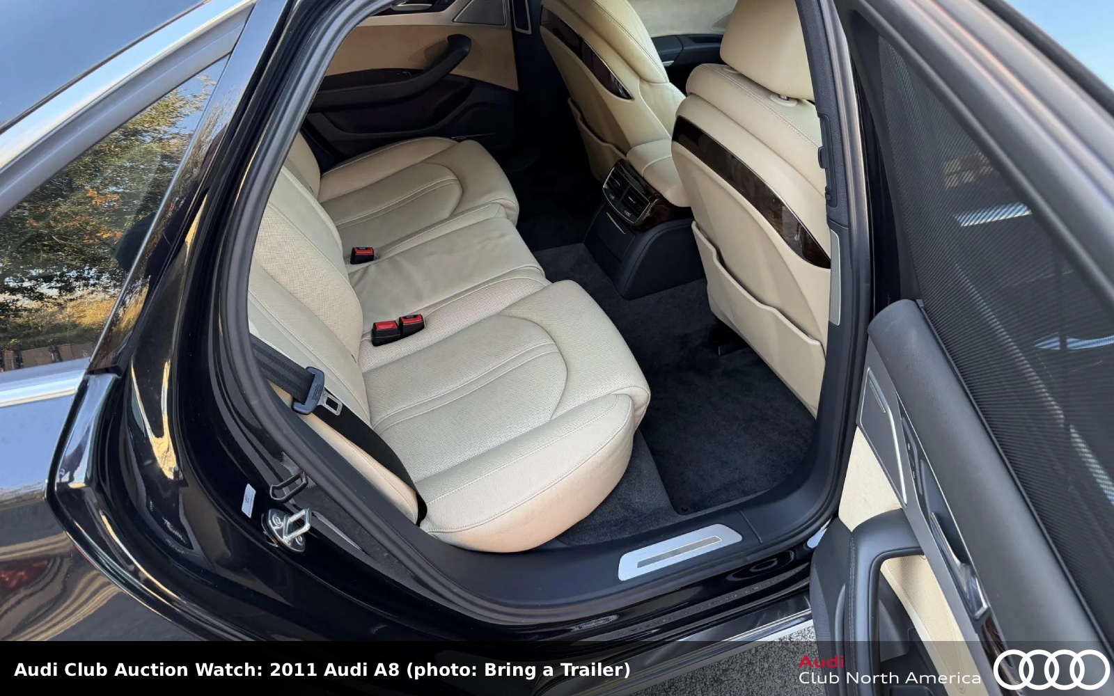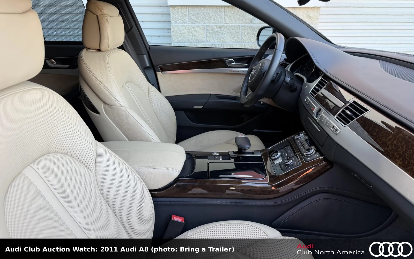 No Reserve. For the four previously reported owners before dealer acquisition, this full-size sedan has low mileage. The exterior is listed as black, the otherwise black interior has heated and ventilated beige leather front seats, beige Alcantara door panel inserts, dark brown walnut wood trim, rear window shades, a back-up camera, Audi MMI infotainment with navigation, and Bose sound. The chassis rides on an adaptive air suspension. The 4.2L V8, 372HP/328 lb-ft, bolts to an 8-speed Tiptronic. Carfax reports minor damage to the front in February 2019.
