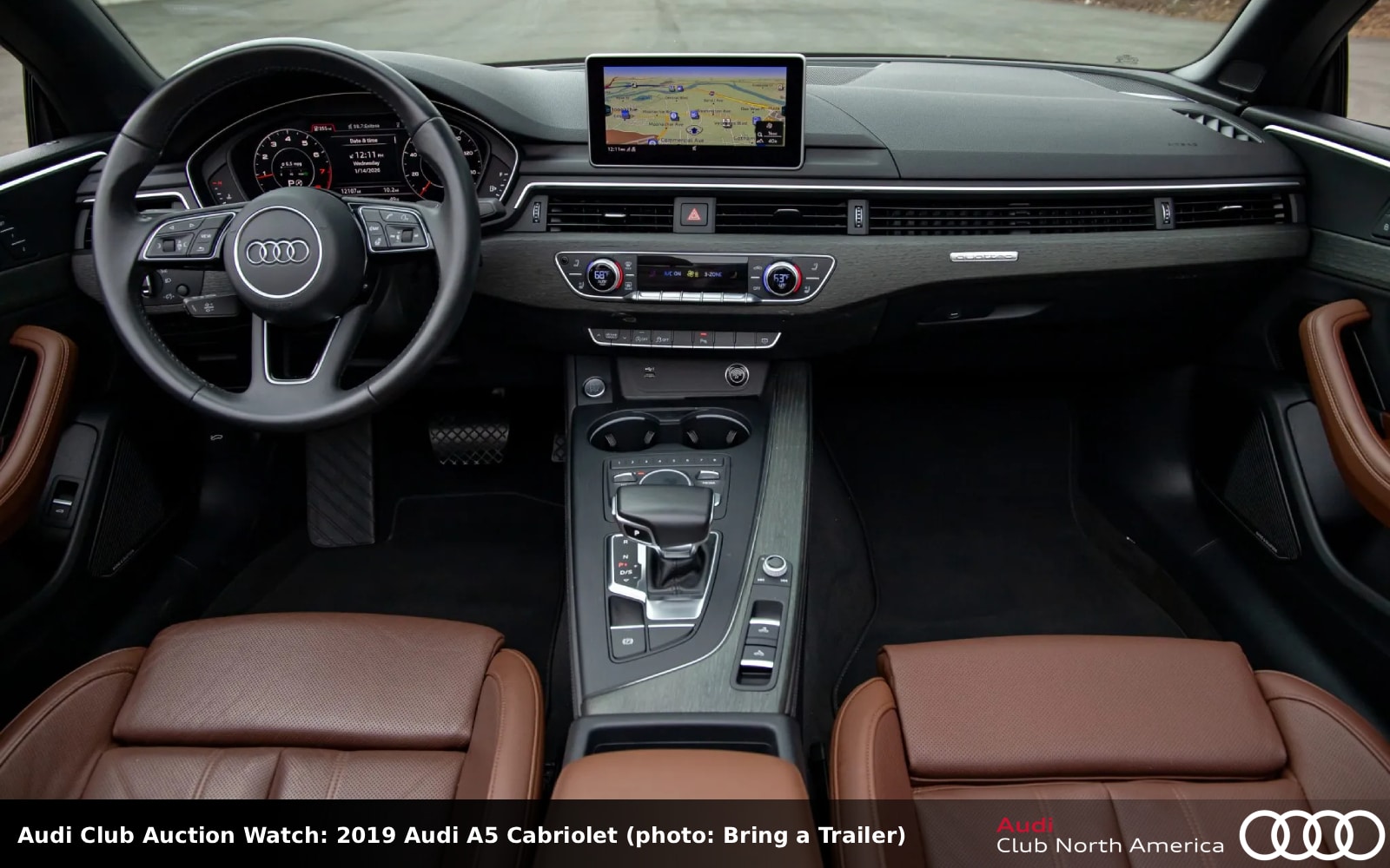 This Brilliant Black drophead coupe has a black soft top over an interior featuring Nougat Brown leather seats and arm rests. Also inside are gray oak natural wood trim, Audi MMI infotainment with navigation, a heated steering wheel, and B&O sound. The turbocharged 2.0L I4, factory rated at 248HP/273 lb-ft, pairs well with a 7-speed S tronic to power the quattro with Ultra front-wheel bias system. Carfax reports two previous owners and no accidents/damage.