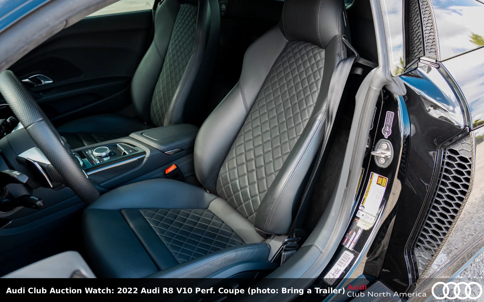 This is the up-spec version of the R8 with a 5.2L V10 that Audi rated at 602HP/413 lb-ft which feeds a 7-speed S tronic. The Mythos Black metallic exterior has carbon fiber wing and side blades, black rings and badges, clear paint protection film covers the nose, and a ceramic coating was applied to the body and wheels. The black interior has a Nappa leather Sport seat package, Carbon Sigma high-gloss trim, a diamond-stitched headliner, and B&O sound. Other optional equipment includes dynamic steering, red brake calipers for the ceramic disks, a carbon fiber front sway bar, and Audi Guard all-weather floor mats. Carfax reports three previous owners and no accidents/damage.