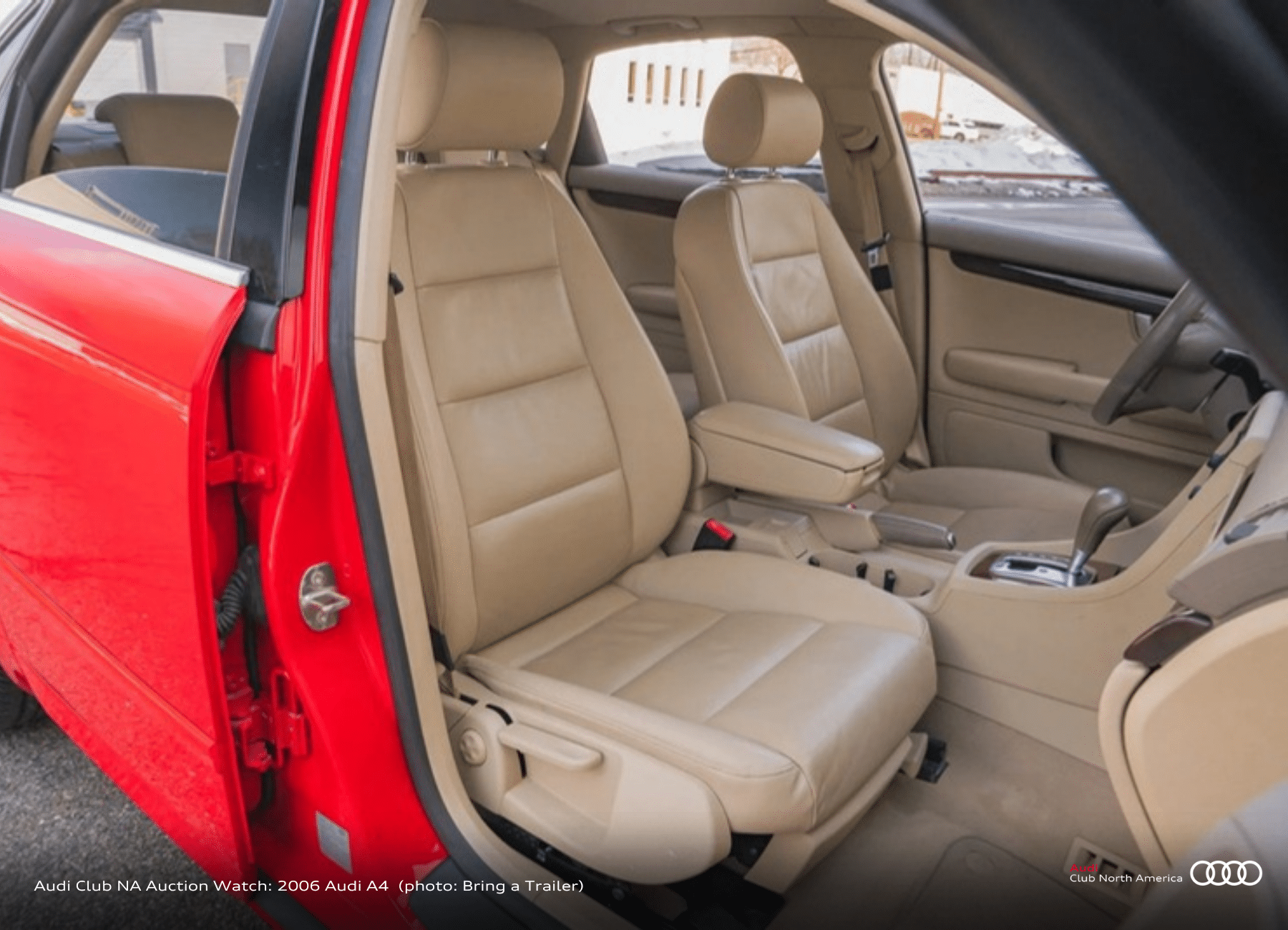 No Reserve. This Brilliant Red sedan is not a quattro, the 2.0L I4, rated at 200HP/207 lb-ft when new, drive the front wheels through a Multitronic CVT unit. The interior is very Beige with leather seats, Dark Walnut wood trim, a Sunroof package, an Audi Symphony CD/cassette stereo, and is cooled by an air conditioning compressor replaced in January 2025. Carfax reports two previous owners prior to dealer acquisition, a good service history, and no accidents/damage. However, the listing notes “scuffs are visible around the body” and “the bump stops are torn.”