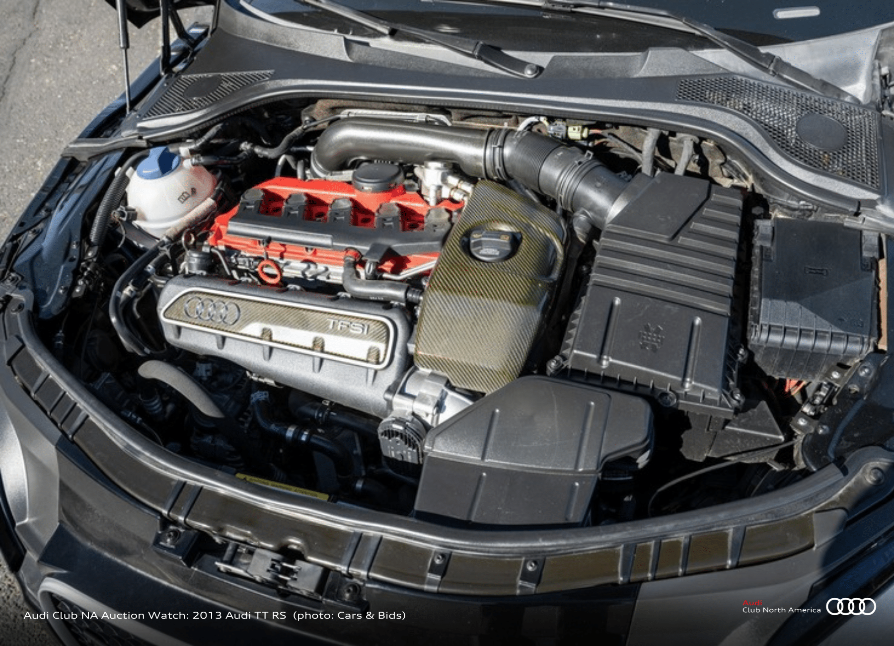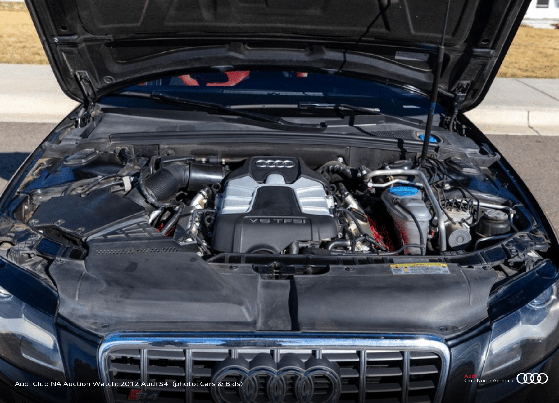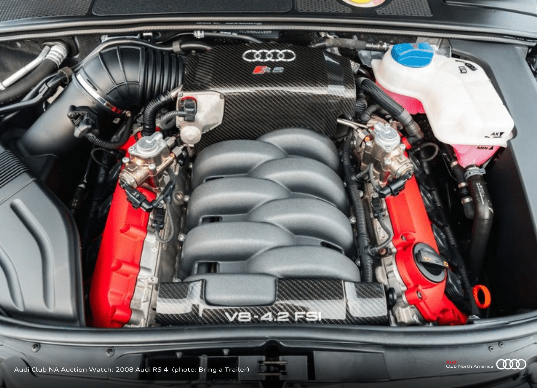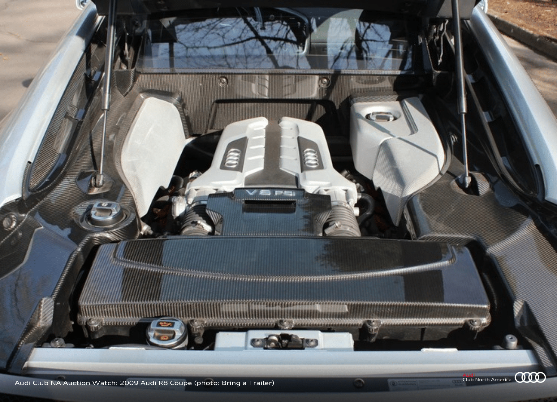Bid quickly, this action ends mid-PM today! No Reserve. Another shade of black, Panther Black Crystal Effect this time, with a distinct purple hue. The black interior has Nappa leather seats, carbon fiber trim, and B&O sound. The 4.2L V8 was factory rated at 450HP/317 lb-ft when new, has a carbon-fiber engine cover, and pairs well with a 7-speed S tronic. Carfax reports minor damage to the front and left front in May 2024 which the seller attributes to the car being hit while parked. The left front fender, left front wheel, and left headlight were replaced as a result.