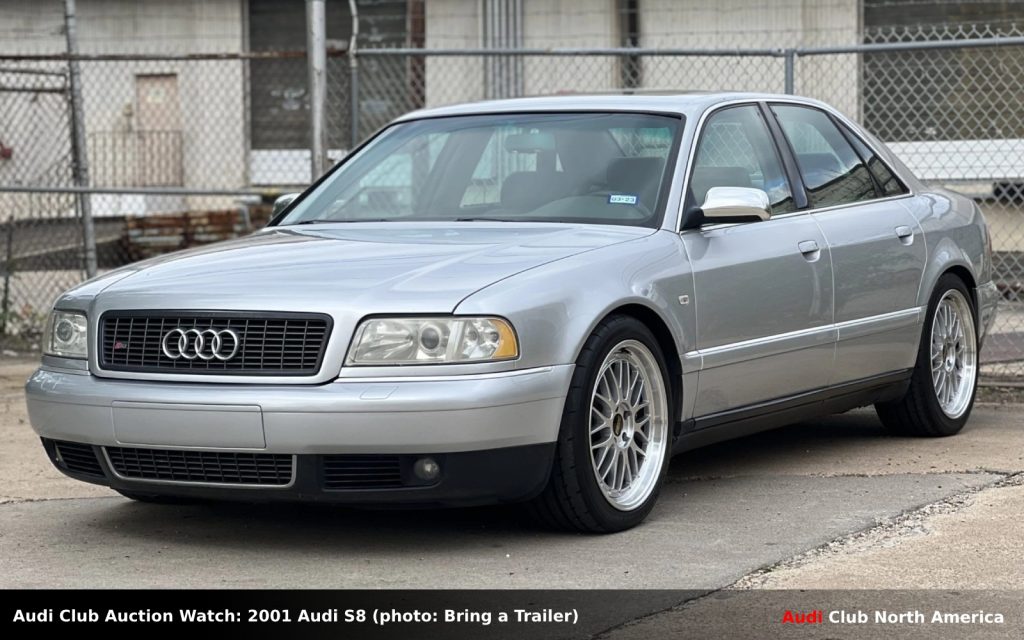 No Reserve.  A D2 gen made a bit sportier via a 6-speed manual swap, 19″ BBS LM wheels, and KW coilovers.  The 4.2L V8 (360HP/317 lb-ft) and the entire engine bay needs cleaning and detailing but has had recent service, see listing for details.  The interior, light/dark gray interior with leather/Alcantara seat and wood trim, compliments the silver exterior.  Clean Carfax report.