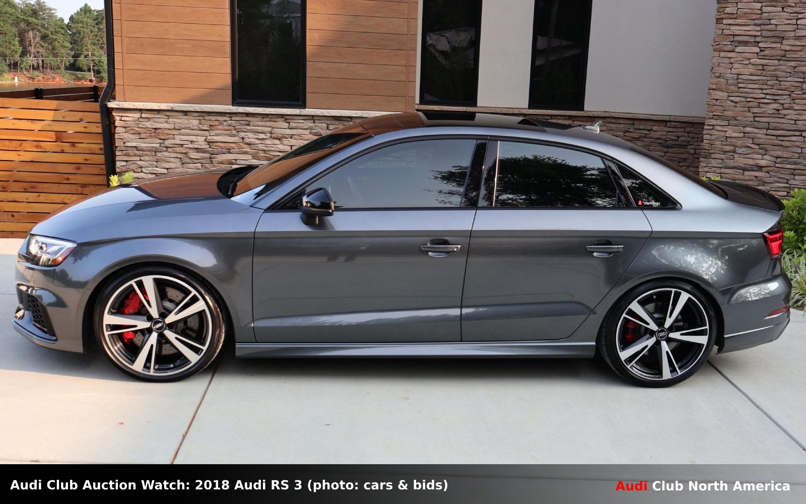 The 2.5L turbocharged I5, factory rated at 400HP/354 lb-ft, spins a 7-speed S tronic and highlights this car. The paint color is Daytona Gray pearl and its front bumper, hood, A-pillars, side mirrors, and door handles are covered with paint protection film. Options include Dynamic, Black Optic, and Technology packages, and RS carbon decorative inlays. The black interior has Nappa leather seats with contrasting Crescendo Red stitching throughout. The chassis now rides on APR lowering springs. The Carfax report is clean.