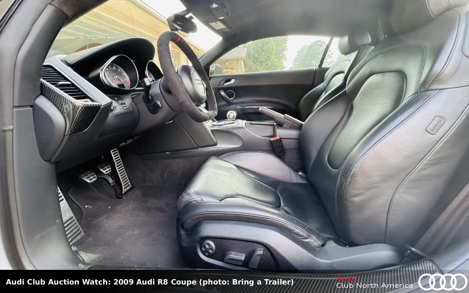 Like the S4 above, this second year R8 coupe is modified but not to the same degree. Under the Arlon Graphics semi-chrome vinyl wrap is an Ice Silver metallic finish, it has carbon fiber side blades and mirror caps as well. Please read the listing for all the mods. Inside the black seats are leather which extends to the dashboard and door panels; it has carbon fiber inlays, Audi Parking System Plus with a rearview camera, an aftermarket shift ball for the 6-speed manual, and a RaceChip system. The 4.2L V8 exhales into a STaSIS Motorsports exhaust. Carfax reports six owners, the last short-term, and no accidents or damage.
