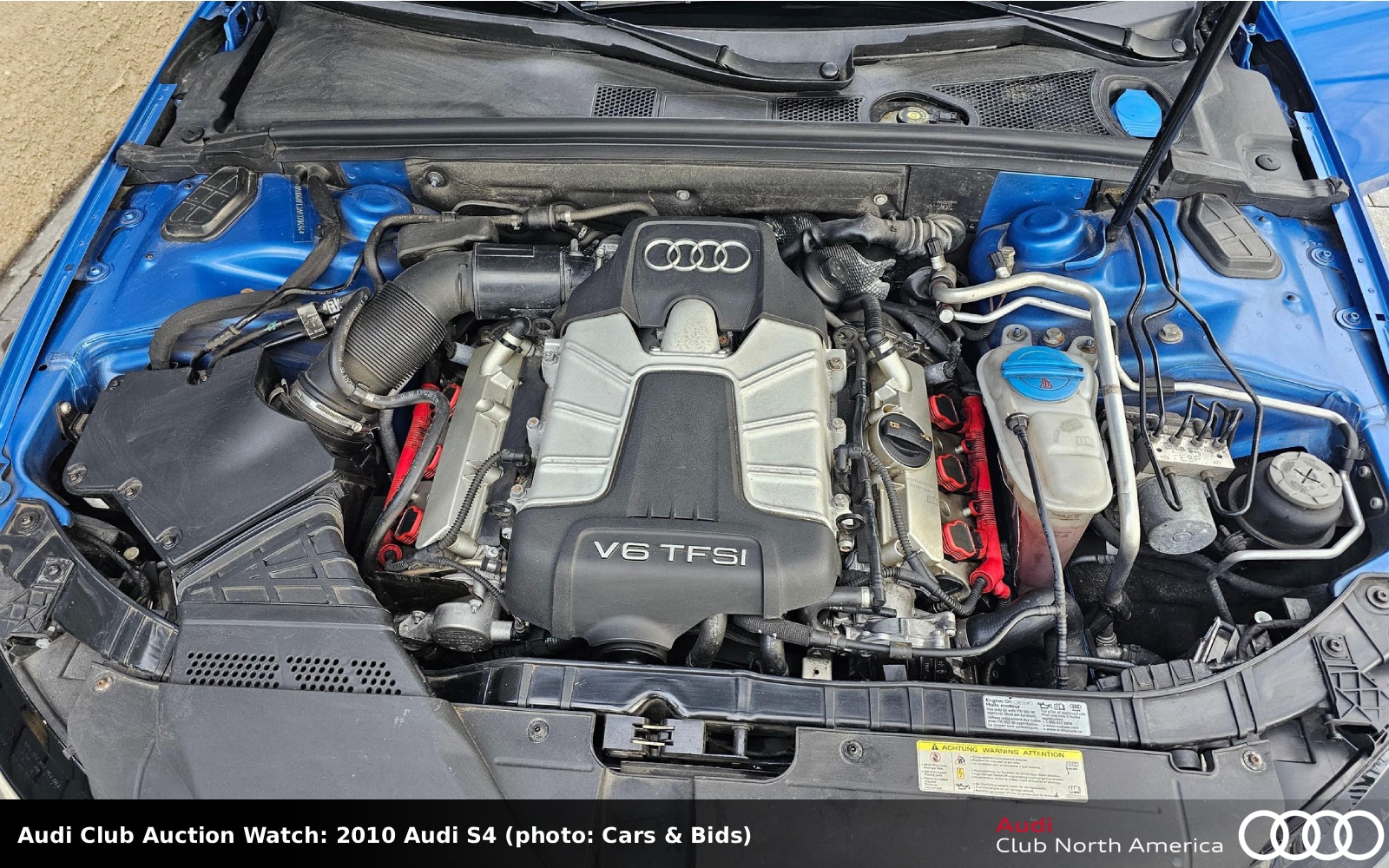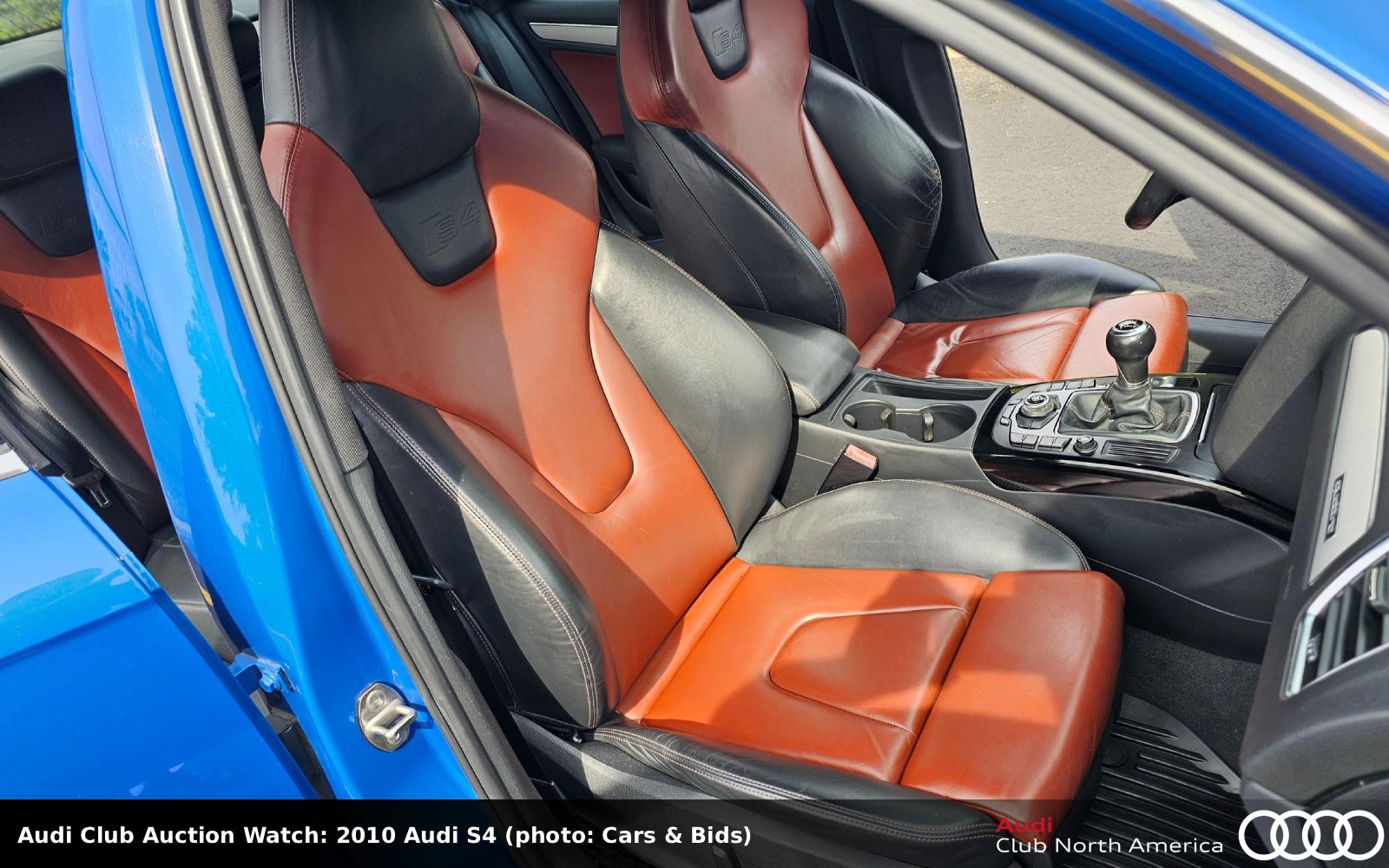 Bid quickly, auction ends early-mid PM today! This Sprint Blue pearl B8 sedan has Mustang Brown/Black Nappa leather seats, B&O sound, and a sagging headliner inside the cabin. Under the hood is a supercharged 3.0L V6 (333HP/325 lb-ft) that spins a 6-speed manual with optional Sport diff. Mods include 19” rotor wheels, AWE exhaust tips, an aftermarket short shifter, MMI Bluetooth adapter, and a flat-bottom steering wheel. Carfax reports minor damage to the front, left front, and rear in September 2022. The seller notes the vehicle was hit while parked. It also desperately needs tires.
