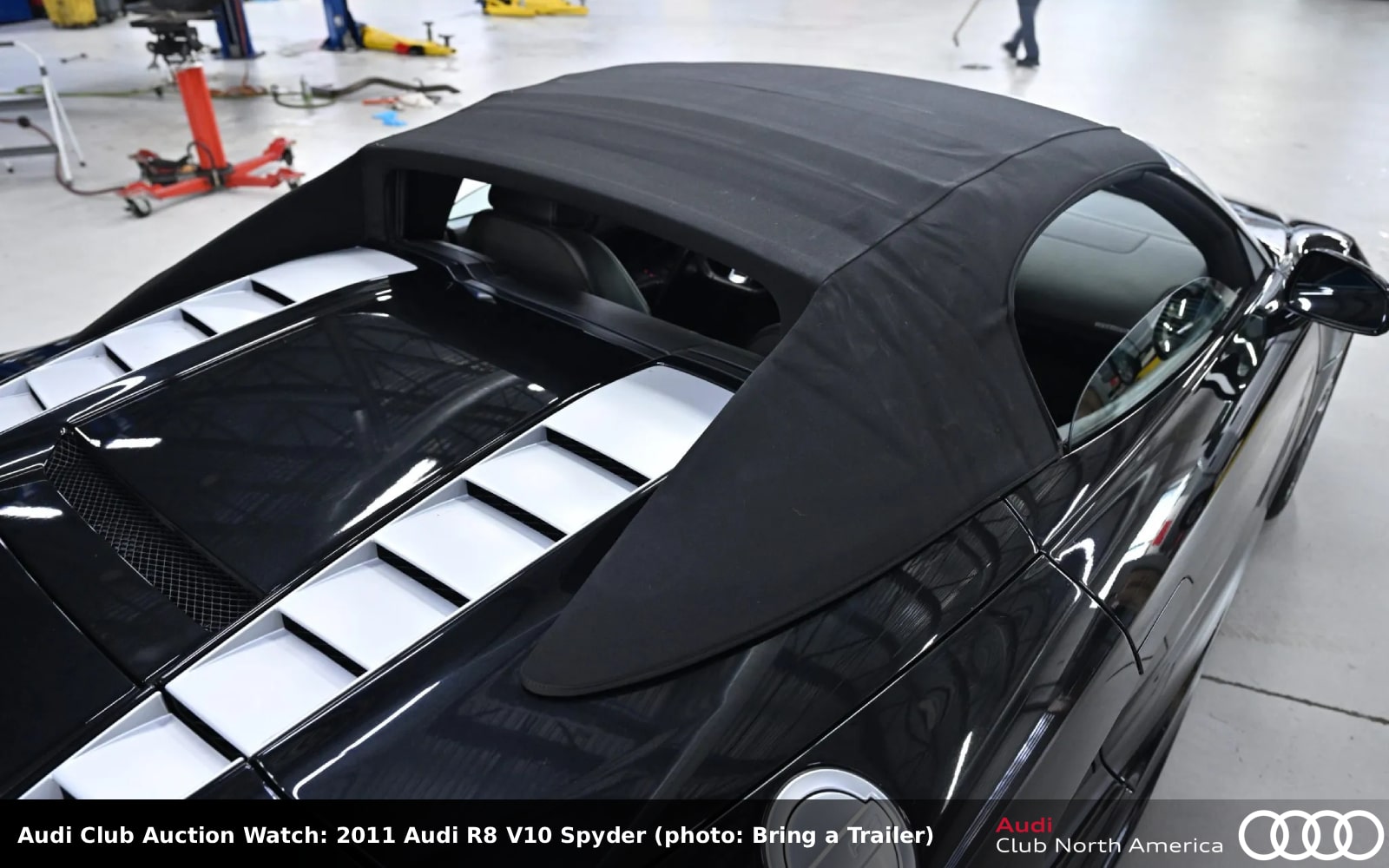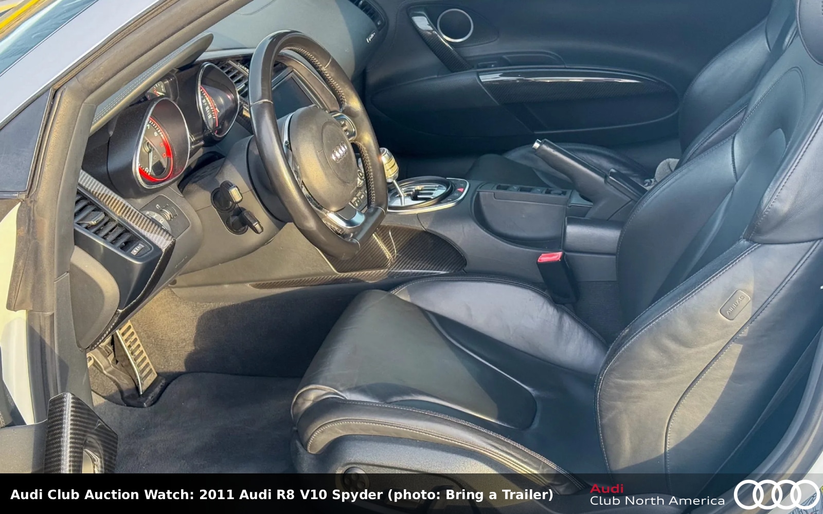 No Reserve. The first spyder is in Ibis White and has a black soft top with a Carbon Fiber Sigma Exterior package. The black interior has leather seats, carbon fiber trim, Audi Parking System Plus with a rearview camera, and an Audi Concert CD stereo with B&O sound. The 5.2L V10 (525HP/391 lb-ft) exhales in a valved iPE exhaust and spins a 6-speed manual. The OEM exhaust comes with the sale as does the OEM front grille. Carfax reports moderate damage from a rear-end collision in September 2013 and also moderate damage to the front and left side with airbag deployment in March 2014.