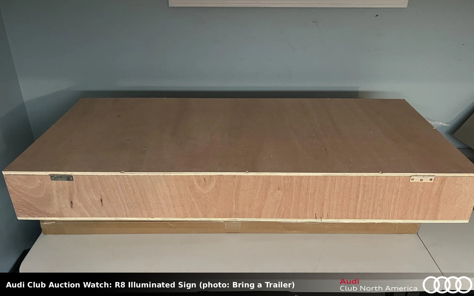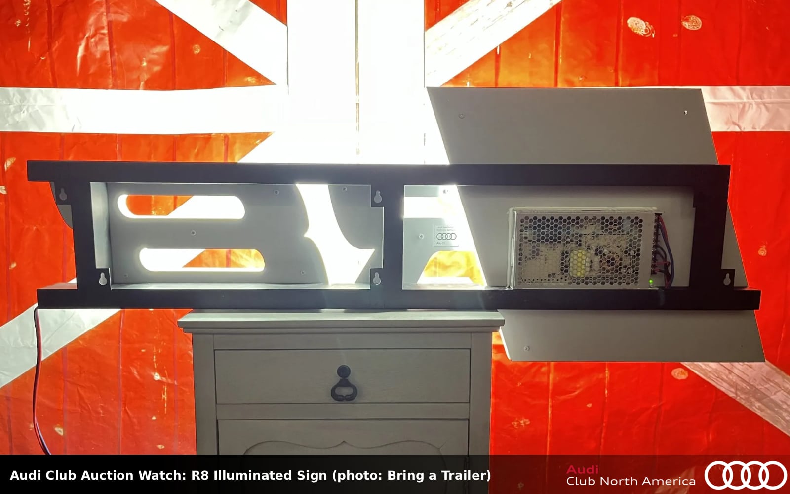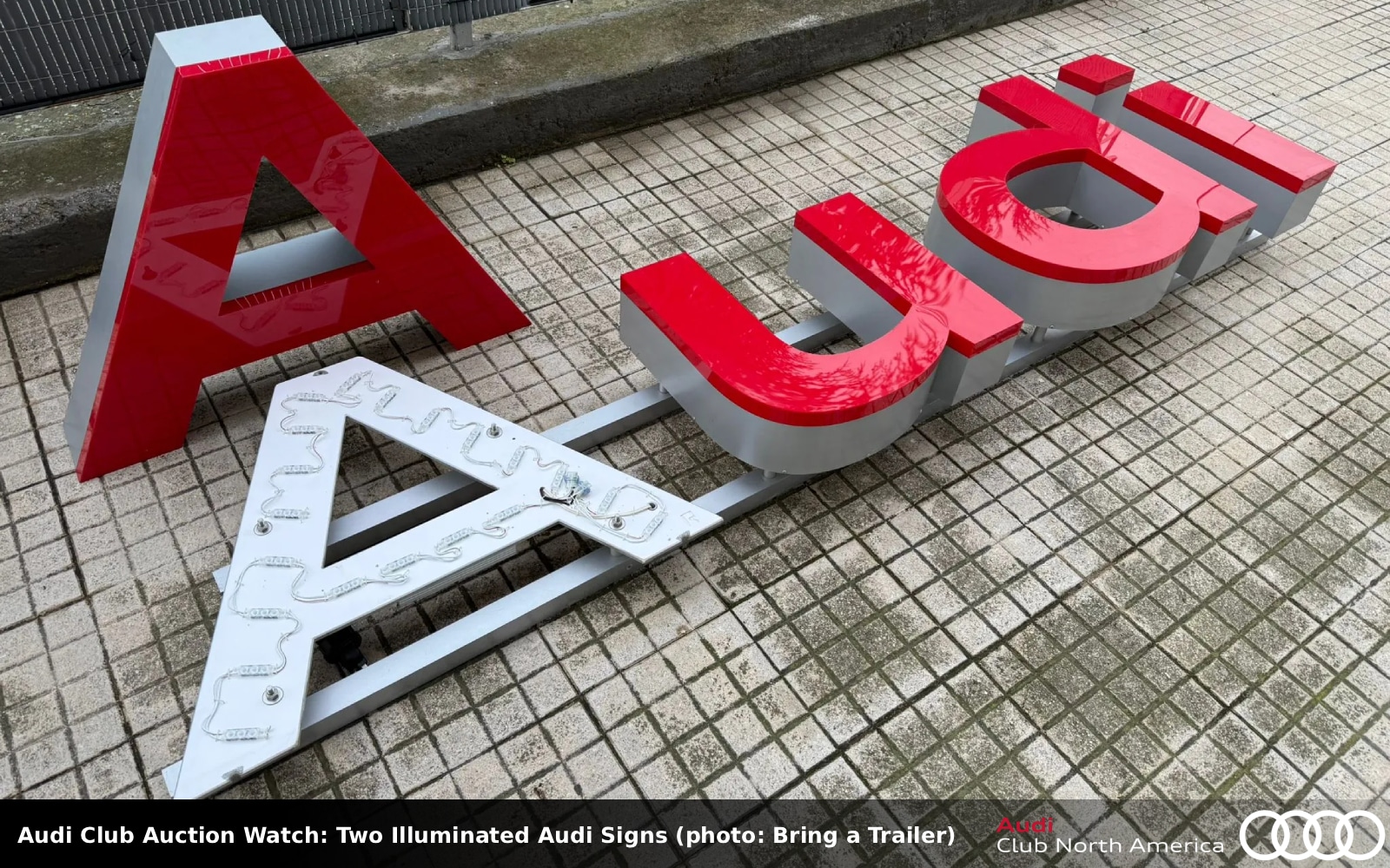 No Reserve. Twice in one week LED garage-hangers signs are listed and there are two in this deal. The first sign is the four rings which have a chrome-effect finish and measures 95″ wide by 34.5″ tall by 6″ deep. The second sign says Audi in red font, it measures 92.5″ wide by 24″ tall by 5.5″ deep. Both are powered by 12-volt wiring, a transformer, and a plug adapter for use in North America. Construction consists of metal frames and translucent plastic faces. While the listing doesn’t say anything about a shipping box, one is pictured in listing photos 52 and 53 and the seller first comment says, “Both signs are securely crated.”