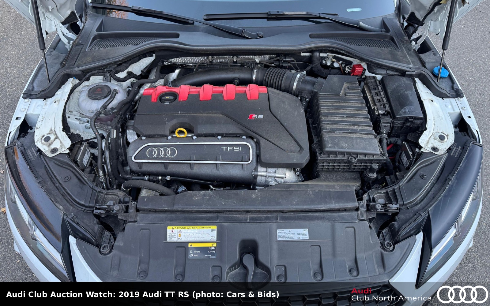 The drivetrain in this Glacier White metallic with Black Optics coupe was given the go-faster treatment using parts from Audi Club sponsor Unitronic. The 2.5L I5 runs their Stage 1+ ECU tune, exhales into their midpipes, and the 7-speed S tronic shift to their Stage 2 TCU tune. Other mods include AWE SwitchPath exhaust, H&R Street Performance coilovers, a KW electronic damping cancellation kit, and 18” Neuspeed RSe11R wheels. The black interior features red-stitched Fine Nappa leather seats, carbon fiber trim, an RS Design package in red, and WeatherTech floor mats. Carfax reports three previous owners and no accidents or damage but the engine bay deserves a good detailing.