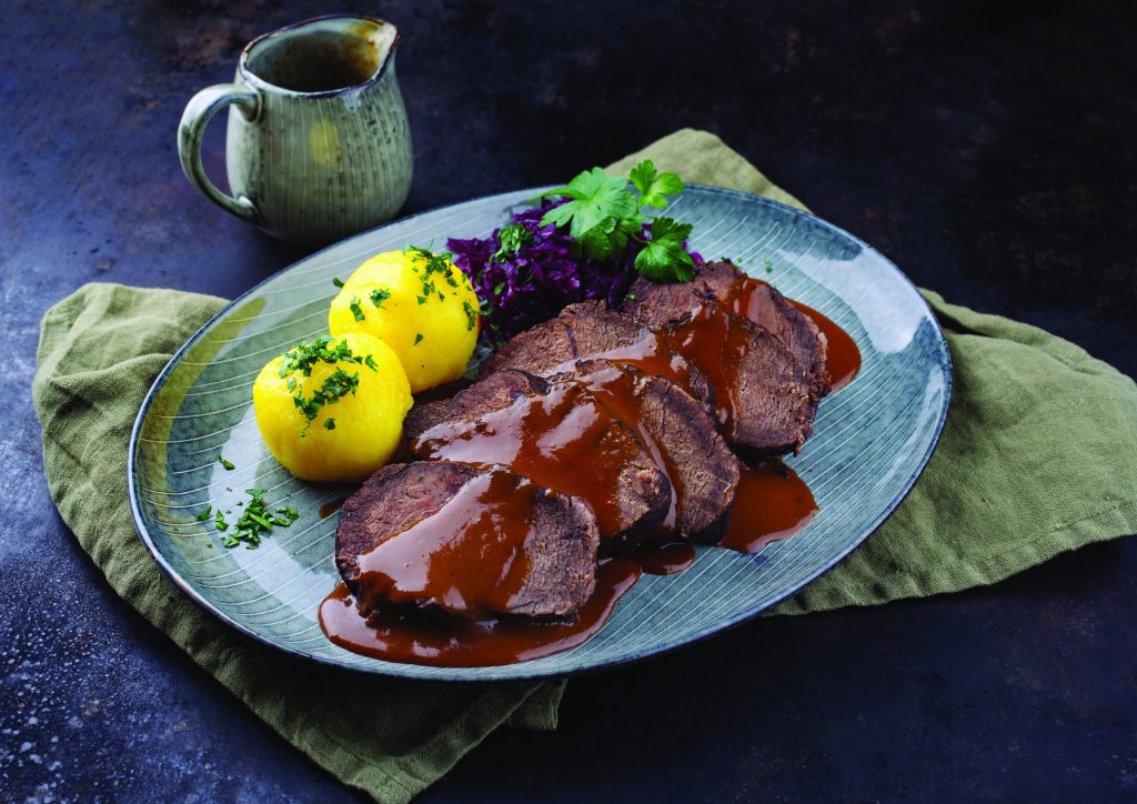 In its seasonal four-course menu, the fine dining restaurant AVUS serves beetroot tartare with avocado and horseradish as an appetizer. After a parsnip and carrot soup with ginger and turmeric, roast beef with apple, red cabbage and potato dumplings follows in the main course. For dessert, there is lemon mousse with meringe and orange-grapefruit ragout. The culinary experience is for two people at a total price of 89 euros.
