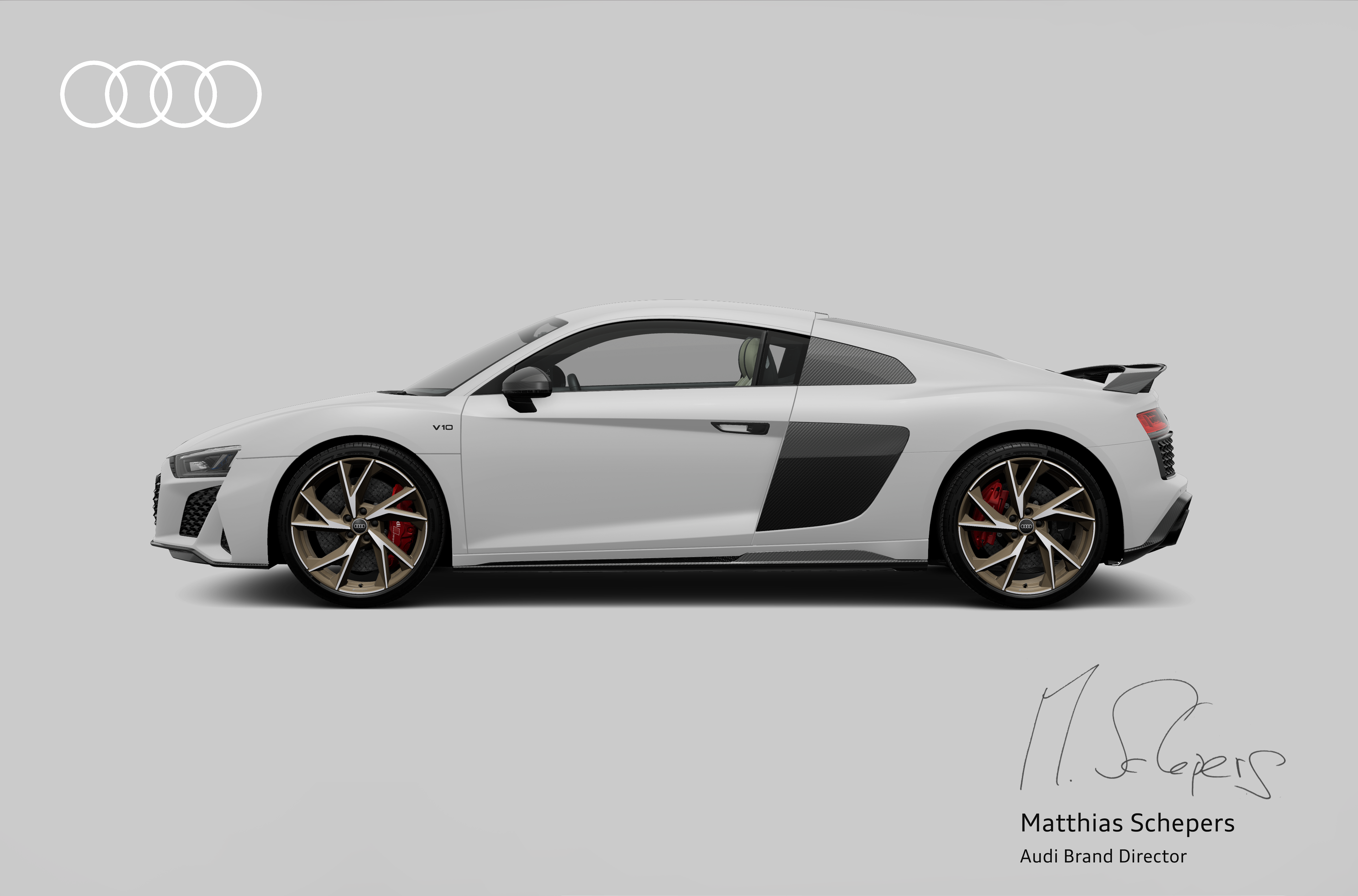 Audi R8 is a high-performer by Audi Sport GmbH, which develops, manufactures and sells Audi racing models and ultimate sports grade RS models, and inherits the genes of Audi racing cars. As a flagship sports coupe that combines excellent ride comfort in daily driving, it has continued to evolve over the past 17 years and has attracted fans from all over the world. The limited model Audi R8 Coupé Japan final edition is a limited edition of only 8 units that combines its overwhelming performance with Japanese aesthetic sense as the Audi R8 enters the final chapter of history. It was made for Japanese customers as Dell. The simple and elegant horizontal form of the body is combined with the black Audi rings package that uses carbon parts everywhere and tightens the exterior stoically, and is an unparalleled performer of R8 It symbolizes Su. The body color adopts a high-quality and soft Ibis white mat, and the combination with the gloss caliper of the ceramic brake that implies high performance produces the gorgeousness of ancient Japanese red and white. The feet are equipped with aluminum wheels with a 20-inch 5 Evo spoke design made by Audi Sport, which is matte bronze polished like gold, which is another theme color. In this way, this limited model Japan final edition casually combines R8, which combines high performance and elegance, with three colors that lead to the Japanese tradition of white, red, and gold, and is dedicated to the Japanese market. It became a limited car full of special feeling.