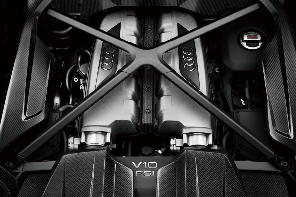 The naturally aspired V-type 10-cylinder engine was set to the Audi R8, which appeared in early 2009, with a direct injection system, with a displacement of 5.2 ℓ and a maximum output of 525 hp. In the Audi R8 GT edition released in 2010, this 10-cylinder engine generated 560 hp, and the Audi R8 V10 plus (since 2012) generated 550 hp. In the second generation R8, which appeared in 2015, we thoroughly reviewed the FSI engine and improved the emission characteristics by adding a fuel injection system to the intake manifold. In addition, the cylinder on demand (COD) system suspends the 5-cylinder of one bank under partial load to improve fuel economy, and the potential of the 5.2 ℓ FSI engine is raised, and it reacts more directly and becomes sharp. I did. Initially, the 540hp and 610hp versions were available, and in subsequent updates, the output was enhanced to 570hp and 620hp.