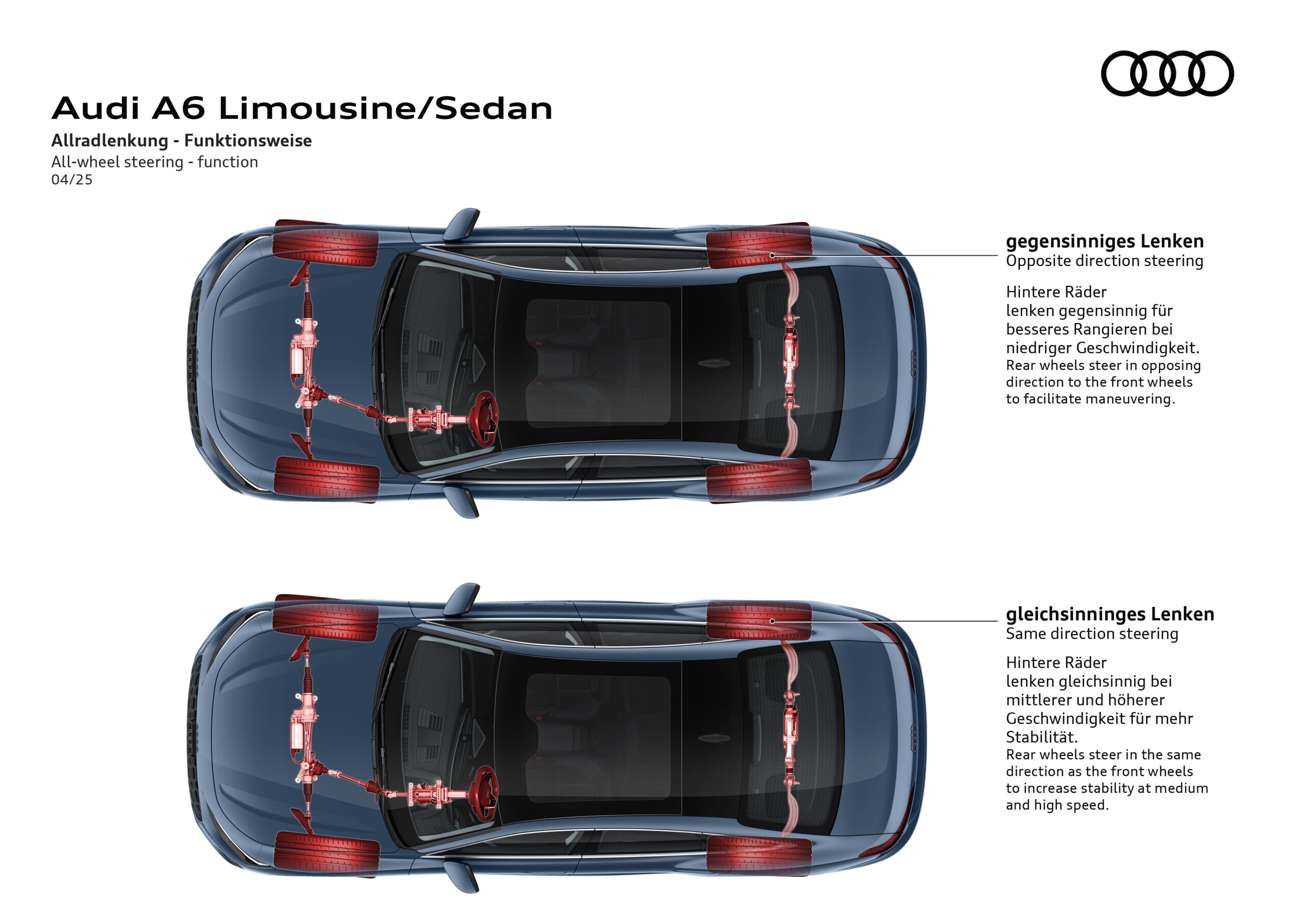 The optional all-wheel steering makes for agile handling and precise maneuvering. Coupled with the stiffer progressive steering, there is a significantly improved and more direct steering response with increased feedback from the road. At low speeds, the all-wheel steering turns the rear wheels up to five degrees in the opposite direction to the front wheels, improving maneuverability in city traffic and tight bends. At medium and higher speeds, the rear wheels turn in the same direction, resulting in stable and even more precise handling.