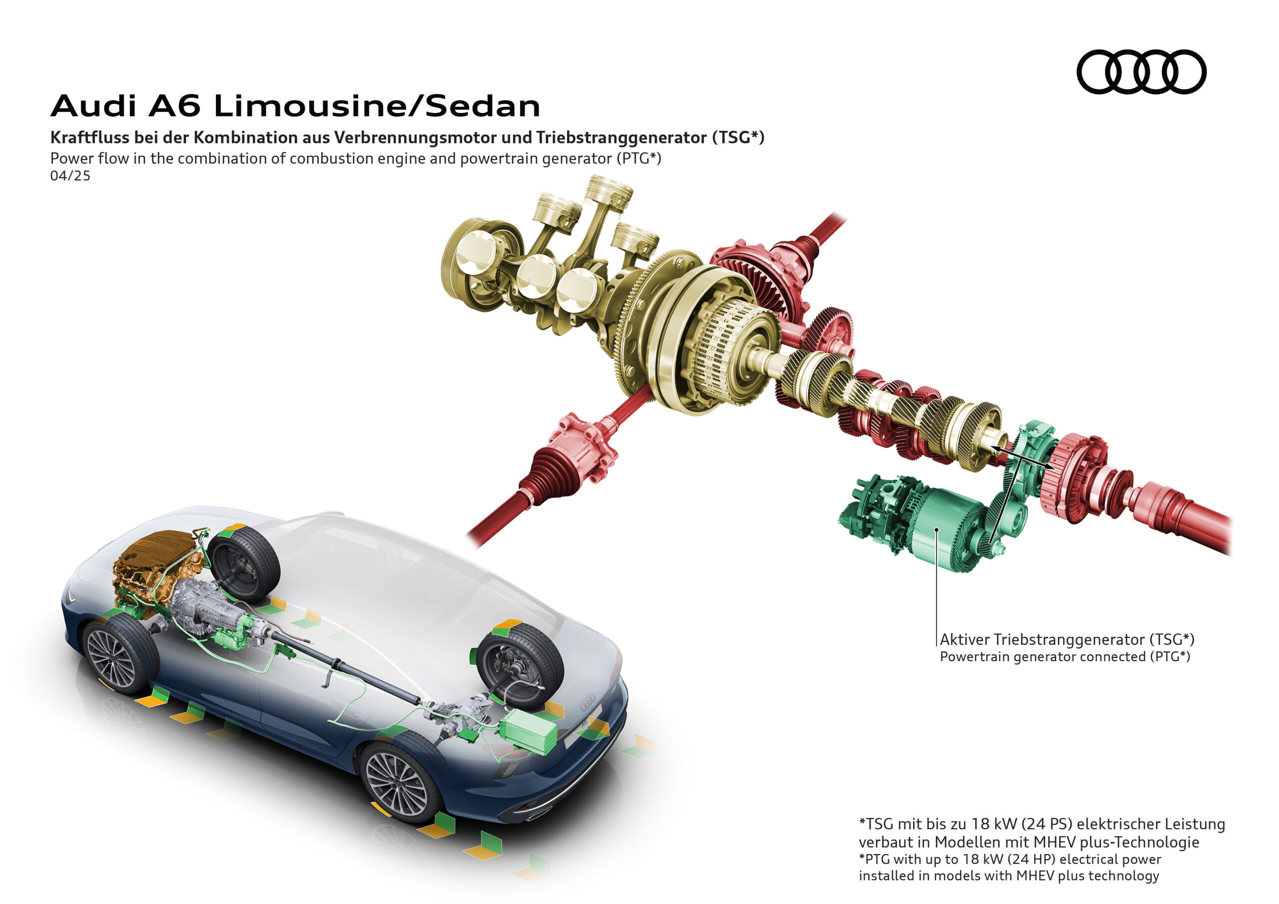 The drives with mild‑hybrid technology MHEV plus play a major role in the outstanding driving experience. In addition to the 2.0 TDI four-cylinder engine with 150 kW (204 PS)1 the 3.0 TFSI six-cylinder engine with 270 kW (367 PS)2 also features this type of partial electrification. The MHEV plus system supports the combustion engine, enhances performance and driving comfort, and reduces CO2 emissions. It enables fully electric parking and maneuvering. The A6 Sedan also runs on electric power when driving slowly in the city, in slow-moving traffic, or outside city limits when coasting to the next village. Furthermore, the MHEV plus technology generates an additional drive torque of up to 230 Newton meters and up to 18 kW (24 PS) of power when starting off or overtaking. Up to 25 kW is recuperated when decelerating.