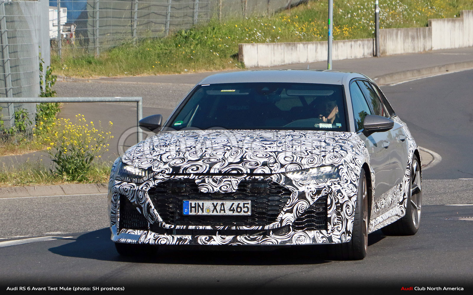 Further evidence of an updated version of today’s Audi RS 6 Avant just popped up yesterday doing manufacturer testing at the Nürburgring in the form of this test mule. Though somewhat masked by camouflage wrap, changes are obvious including augmented flares, bigger rear upper spoiler and freshened front and rear bumper are plainly seen.