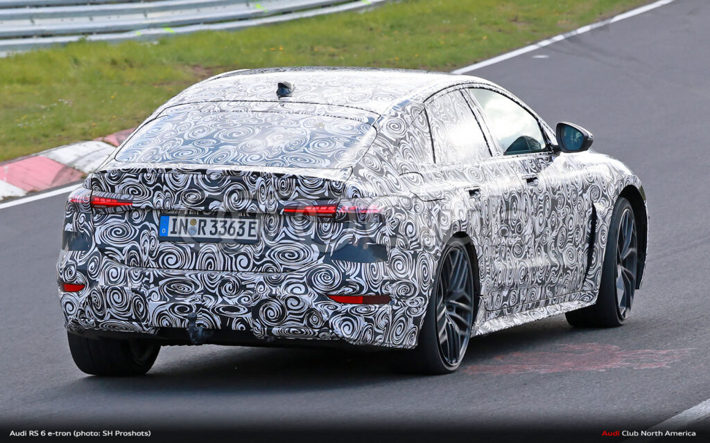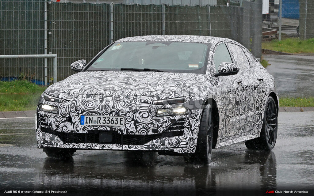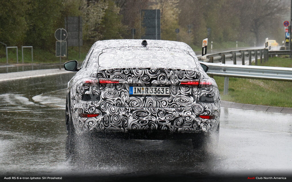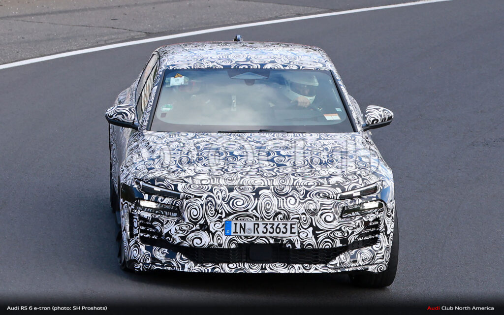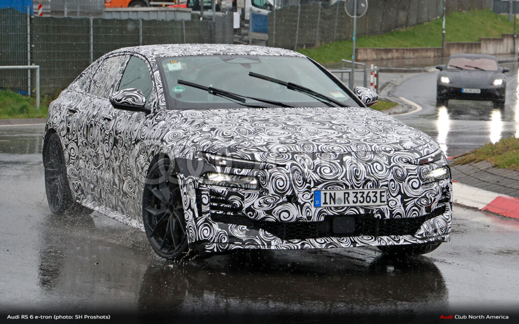 You can also start to see some family resemblance design cues. Note the stacked and separate light assemblies at the front with marker/turnsignals above and headlights below. These are consistent with other electric models like the Q6. Also, there’s what looks like a smile in the lower fascia, similar to what we’ve seen on the RS e-tron GT facelift, but likely to be a more defined rectangular segmentation as was first shown on the RS 6 GT and that now appear to be a thing on the less disguised RS e-tron GT prototype that popped up last week.