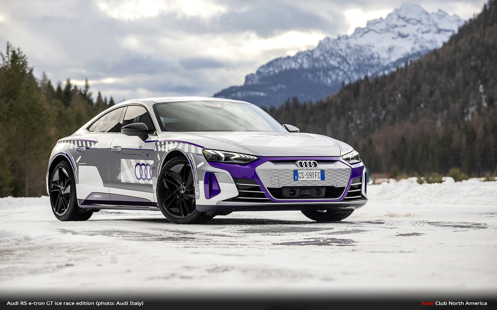 Inspired by the GP Ice Race motoring event, which takes place in Austria on snow and ice, Audi RS e- tron GT ice race edition underlines the proximity of the Brand of the four rings to the White Circus and the sports performances.