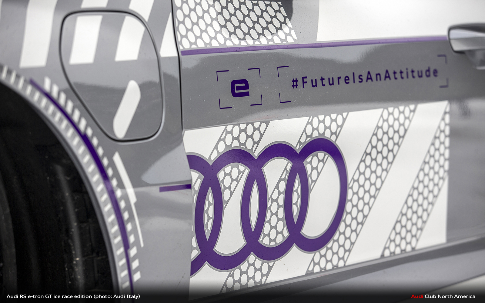 The style of the car, as mentioned, recalls the dominant colors of the winter season as well externally as well as in the passenger compartment. With the Floret silver metallic color and the carbon roof, the Granturismo of the four rings alongside purple accents that recall the ski goggles that sparkle at Sun. Special films are used to create the Audi RS e-tron GT ice race edition decorative, applied along the bodywork, which generate a transparency effect in specific points, adding white tones to the monochromatic silver background so as to replicate the silhouette of the ice crystals. The purple contrasting elements emphasize the muscular character of the car equal to the blank rings.