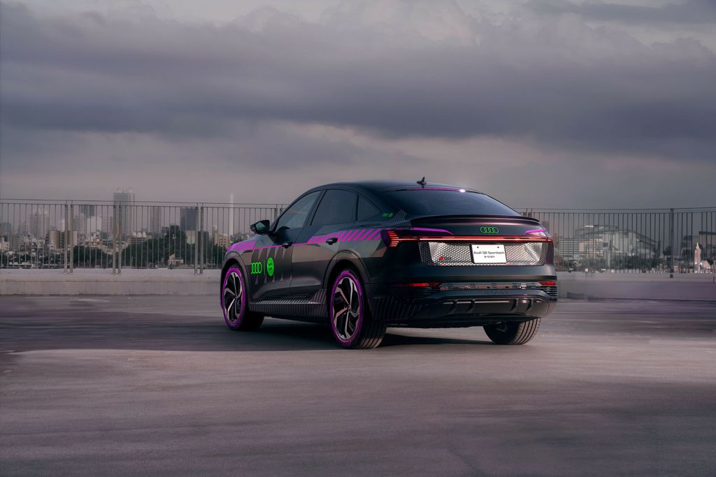 The Audi Q8 e-tron, which will join the FC Bayern Munich team on its trip to Asia, is getting special decals. With the colors black, green, and purple, they reflect the color scheme of the Audi Summer Tour.