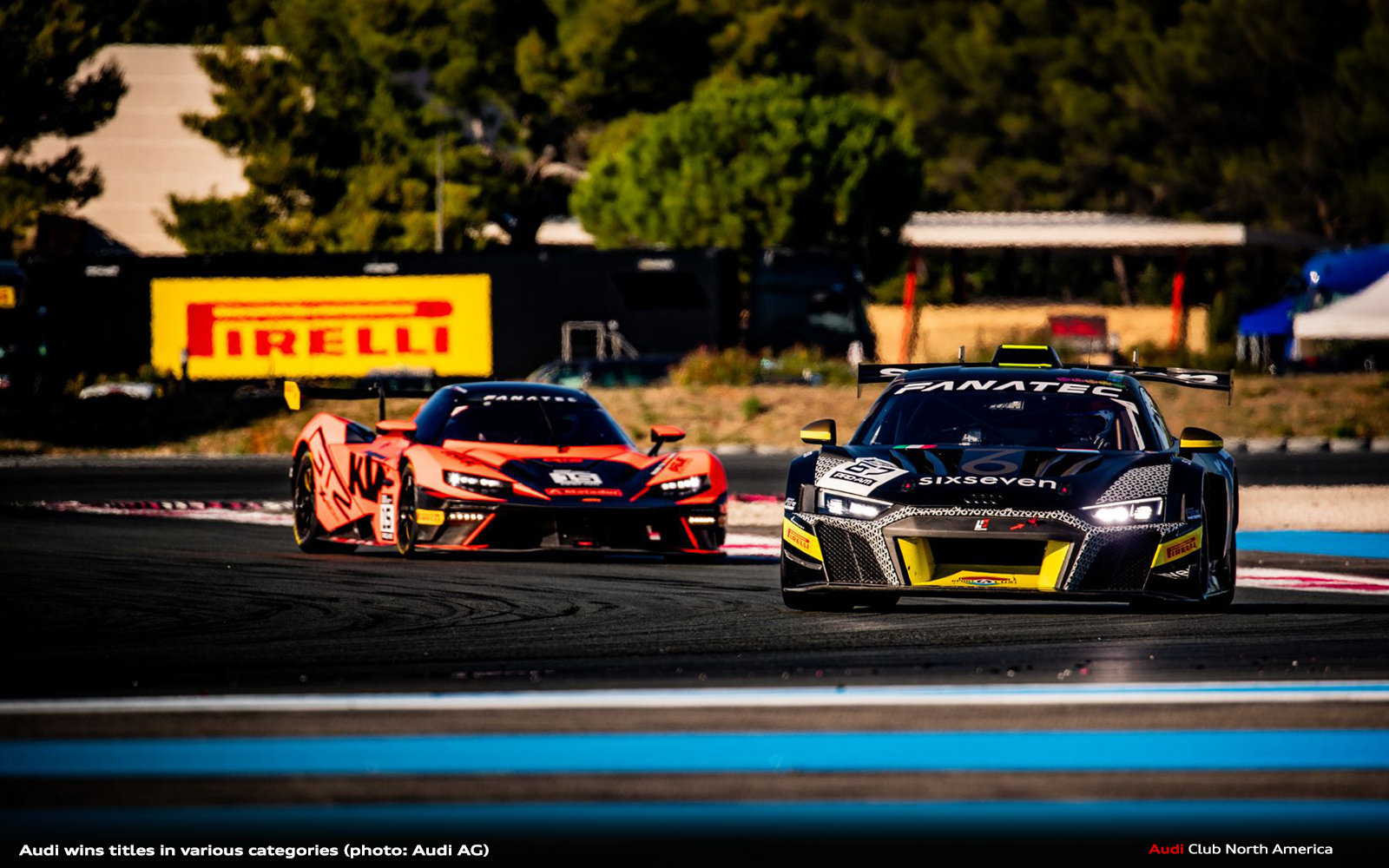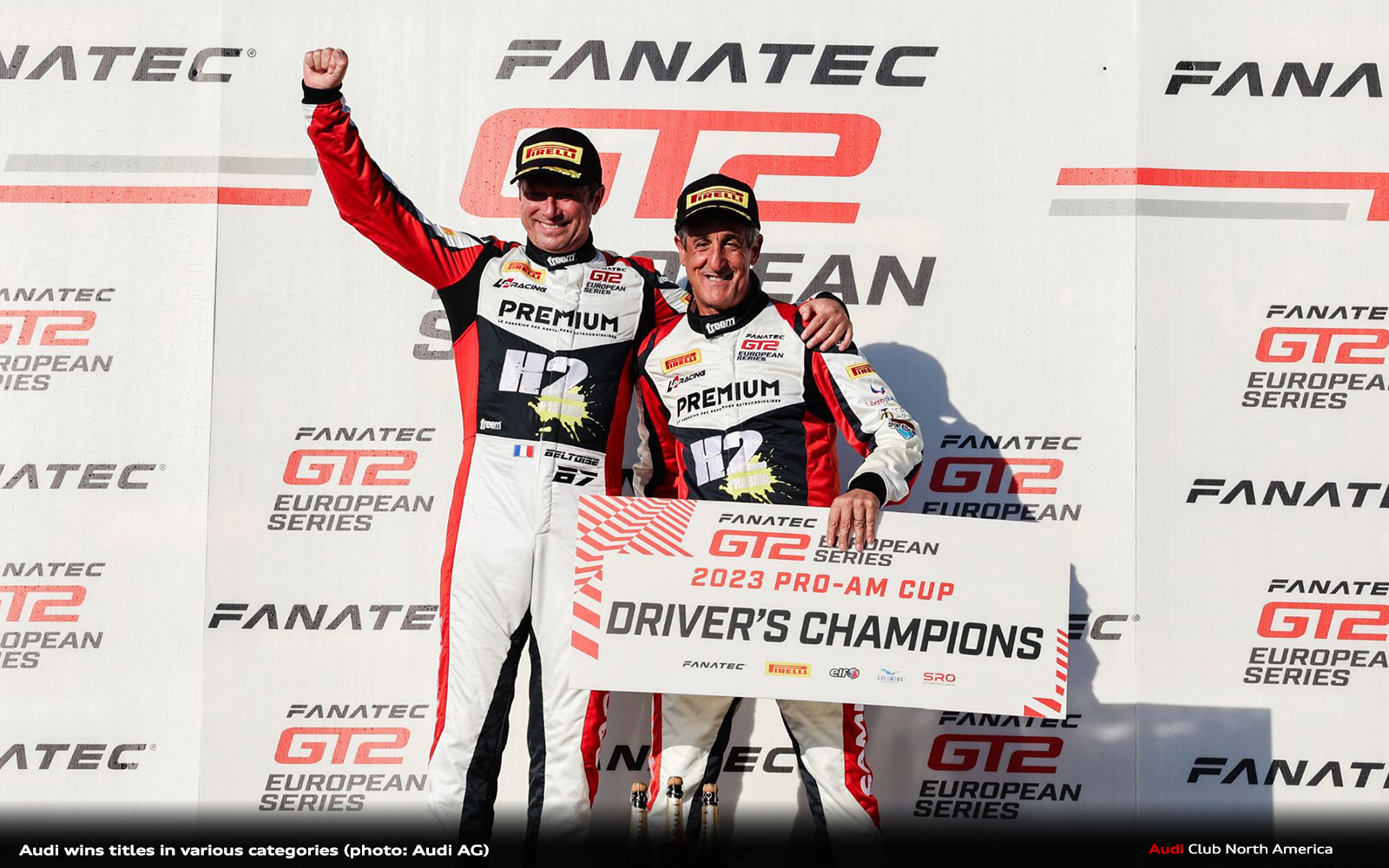 Thrilling finale: For the third time in a row, the GT2 European Series title went to Audi Sport customer racing. At the sixth round of the race series at Le Castellet, Team LP Racing from Italy prevailed in the Pro-Am final classification for the first time after the Danish team High Class Racing in 2021 and PK Carsport from Belgium in 2022 were the previous winners. Anthony Beltoise and Henry Hassid won the race series in the Audi R8 LMS GT2 in an exciting battle with the Audi from PK Carsport. In the first 50-minute race on the southern French circuit, PK Carsport with Peter Guelinckx/Stienes Longin received a ten-second penalty for causing an accident and dropped back to eighth place – three positions behind the championship leaders Beltoise/Hassid. In the second race, no fewer than four teams still had a chance of winning the title. LP Racing, with Anthony Beltoise and Henry Hassid, finished fourth. This was enough to win the race series with a one-point lead over KTM driver Reinhard Kofler. Peter Guelinckx/Stienes Longin subsequently received a ten-second penalty for falling short of the minimum standing time during their mandatory pit stop. The two Belgians, who have won four races this year, had to settle for third place in the standings in the end and are now targeting the title win in the Belcar Endurance Series. With six different brands, the GT2 European Series field at the finale was the best field of the season.