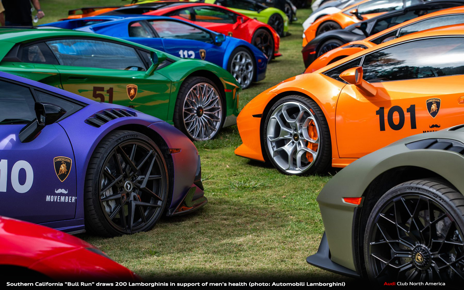 [On] Saturday, Nov 4, a record 200 Lamborghinis took to the roads of Southern California on a collection mission to raise awareness and funding for the world’s leading charity changing the face of men’s health, Movember. Automobili Lamborghini Chairman and Chief Executive Officer, Stephan Winkelmann, as well as Andrea Baldi, Chief Executive Officer Americas, led the drive of passionate fans and customers of all ages. 2023 marks the third consecutive year of partnership with the organization and this Bull Run is one of many taking place globally during the month of November.