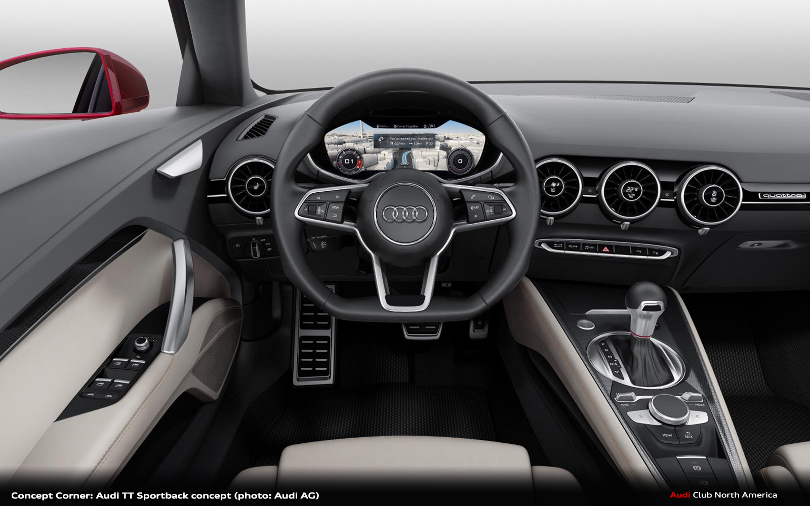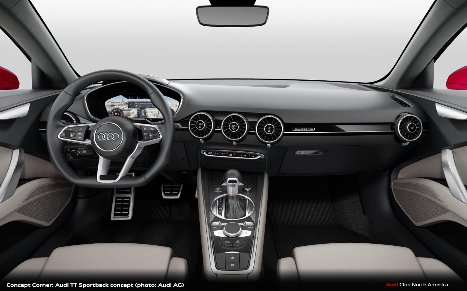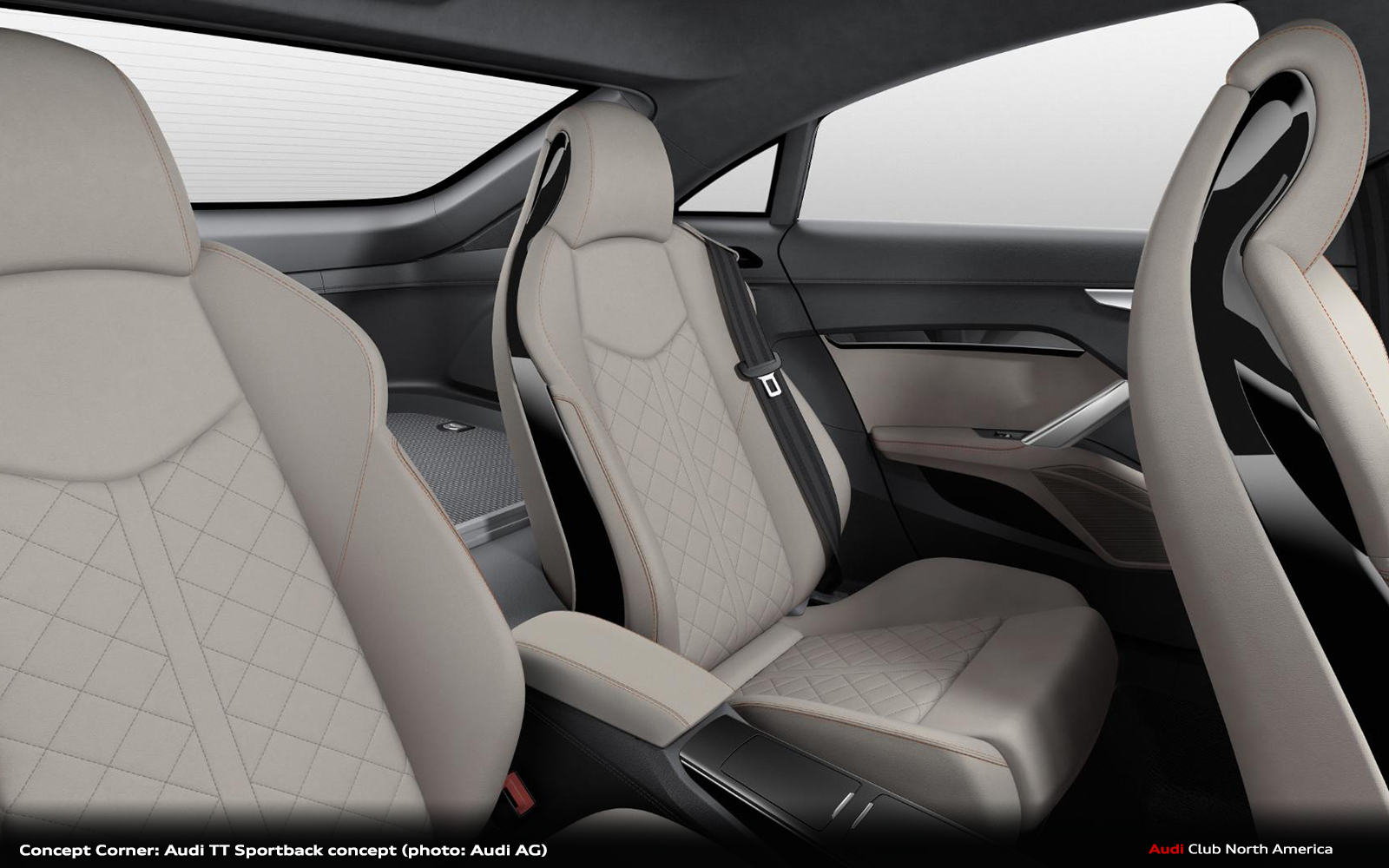 In keeping with the character of sporty elegance, the interior of the Audi TT Sportback concept is defined by the use of high-quality materials. The instrument panel and the upper area of the door trims are dark granite gray in color. The door armrests, the center console and the seats see the use of a new soft leather in parchment beige – this is processed for a particularly near-natural look and has a silky sheen. The door top shoulder is upholstered in Alcantara, parchment beige. The seat upholstery features a diamond pattern. The side bolsters of the seats are trimmed with special accent strips in dark gray leather that are fixed with red thread using a special stitching technique.
