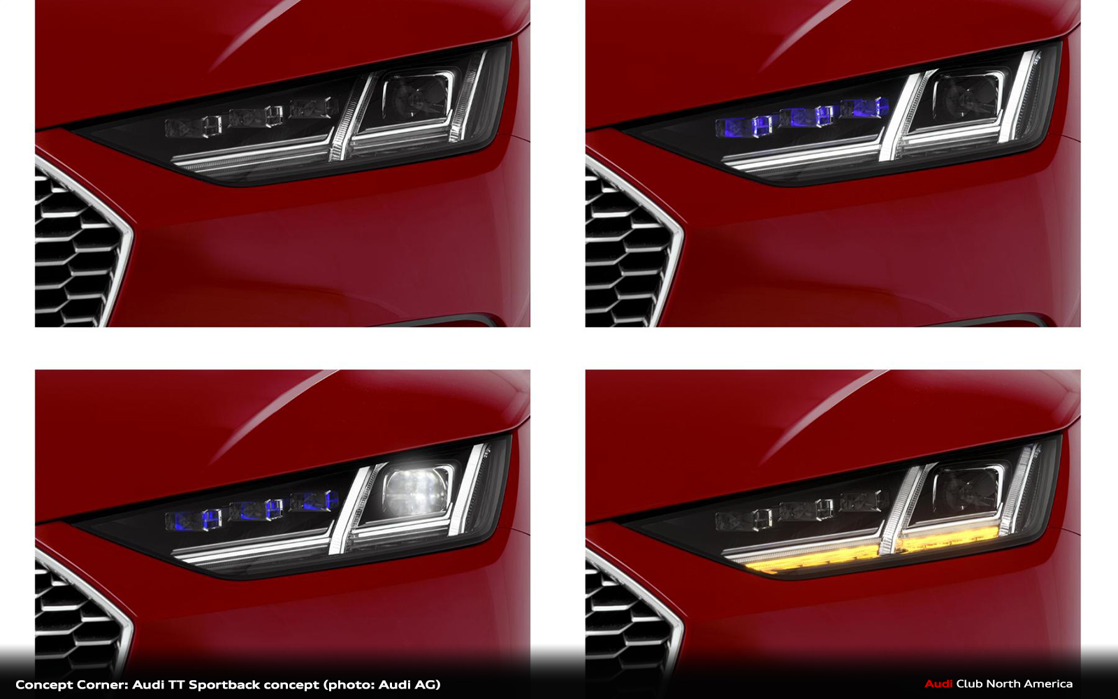 Another typical TT design feature are the newly designed headlights with separators that demonstrate a unique daytime running light signature. On the Audi TT Sportback concept, the high-beam spot is provided by laser technology – in each headlight, a module comprising four powerful diodes generates a beam of light that illuminates several hundred meters. The laser spot, which is activated at 60 km/h ( 37.3 mph) and above, supplements the LED high beam. For the driver, this is a significant boost to visibility and safety; a camera is used to detect and blank out other road users.