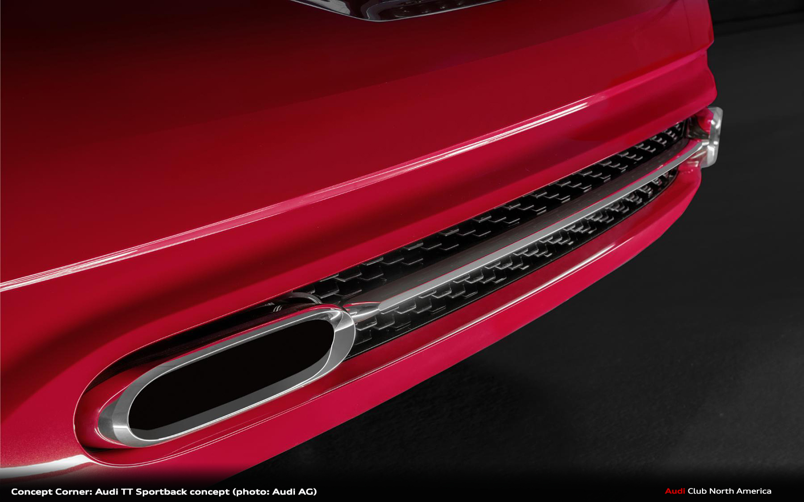 The rear of the Audi TT Sportback concept is also focused and sculptural, with five horizontal lines emphasizing its width. The one-piece rear lights – which also include vertical separators inspired by the R18 – form independent structures. These are linked to one another by the handle edge of the luggage compartment, which constitutes a powerfully contoured continuous trim. The surface that bears the number plate is located in the shadow of the spoiler lip. The two large elliptical tailpipes of the exhaust system are embedded in the diffuser and linked by a trim.