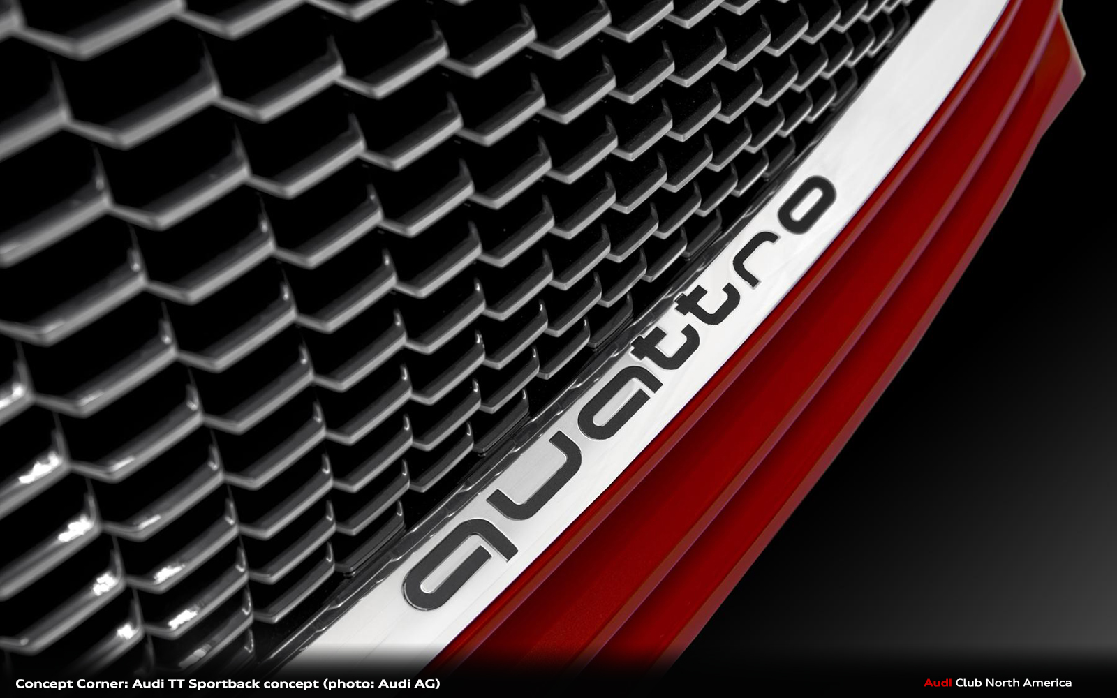 The distinctive horizontal lines at the front end of the new Audi TT Sportback concept reinforce the broad and sporty look. Bearing the quattro badge on its lower edge, the Singleframe grille is flatter and wider than on the two‑door coupe and features a honeycomb grille insert with a resplendent dark aluminum look.