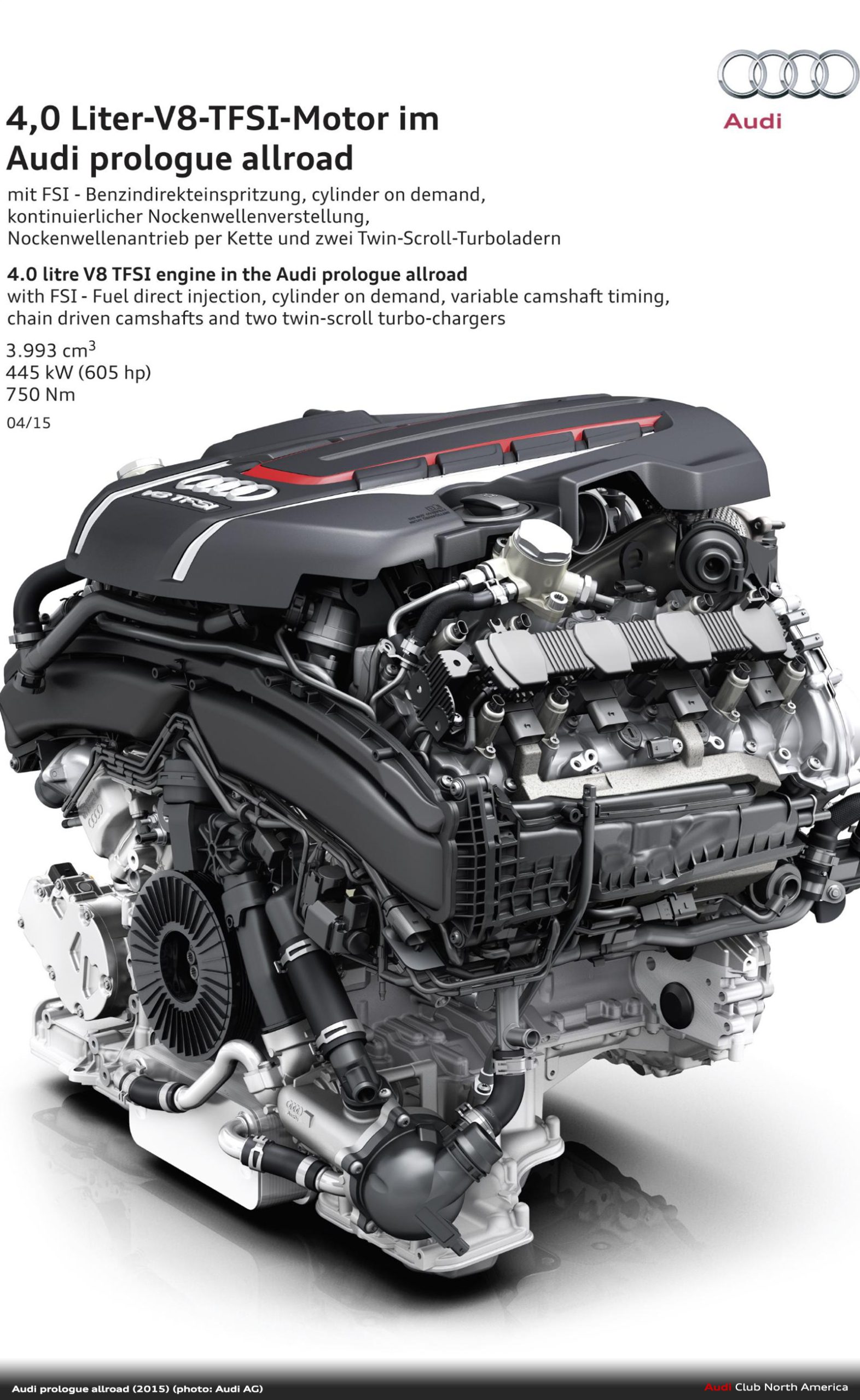 The 4.0 TFSI engine – a V8 with twin turbochargers – and the electric motor integrated into the eight-speed tiptronic produce 540 kW (734 hp) of system power and 900 Nm (663.8 lb-ft) of system torque. The quattro all-wheel drive system utilizes the power of the Audi prologue allroad perfectly in every situation.