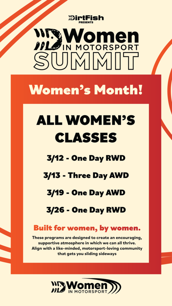 Throughout the rest of the month, DirtFish will run several all-women’s rally driving training events, with two of those sessions scheduled within days of the conference for those who may wish to fly in, attend the conference with Michèle, and then stay on for a few days of learning to more effectively slide sideways in the dirt.
