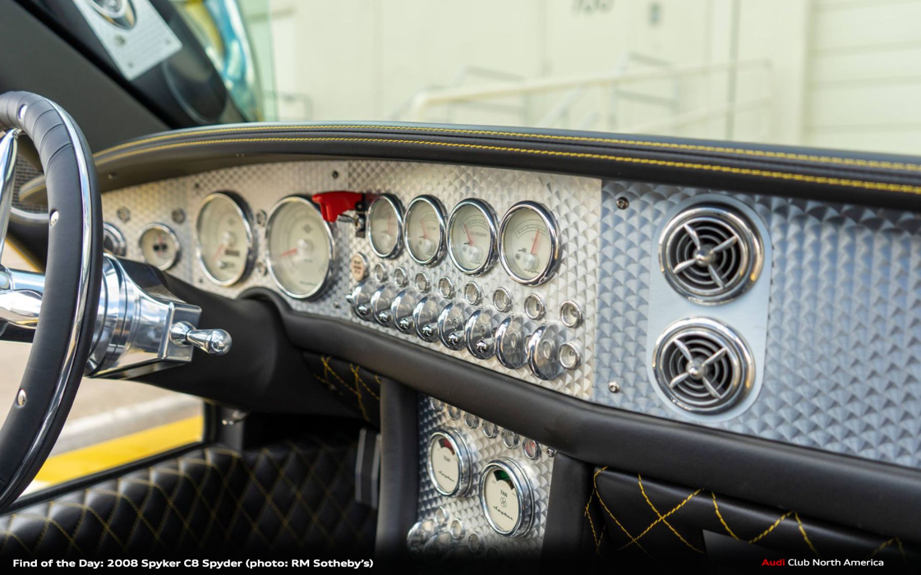 Sliding into the cabin, the driver is met by yet more aerospace inspired touches. A flat aluminum dash wears an intricate, machine-turned pattern while the gauges are all surrounded by chrome bezels and backlit in a striking shade of green. Rows of toggle switches, one of many features which skirt federal regulations due to the Spyker’s limited production numbers, mimic an airplane’s instrument panel. An open shift gate and billet machined pedal box, both with exposed linkages, continue the aerospace experience.