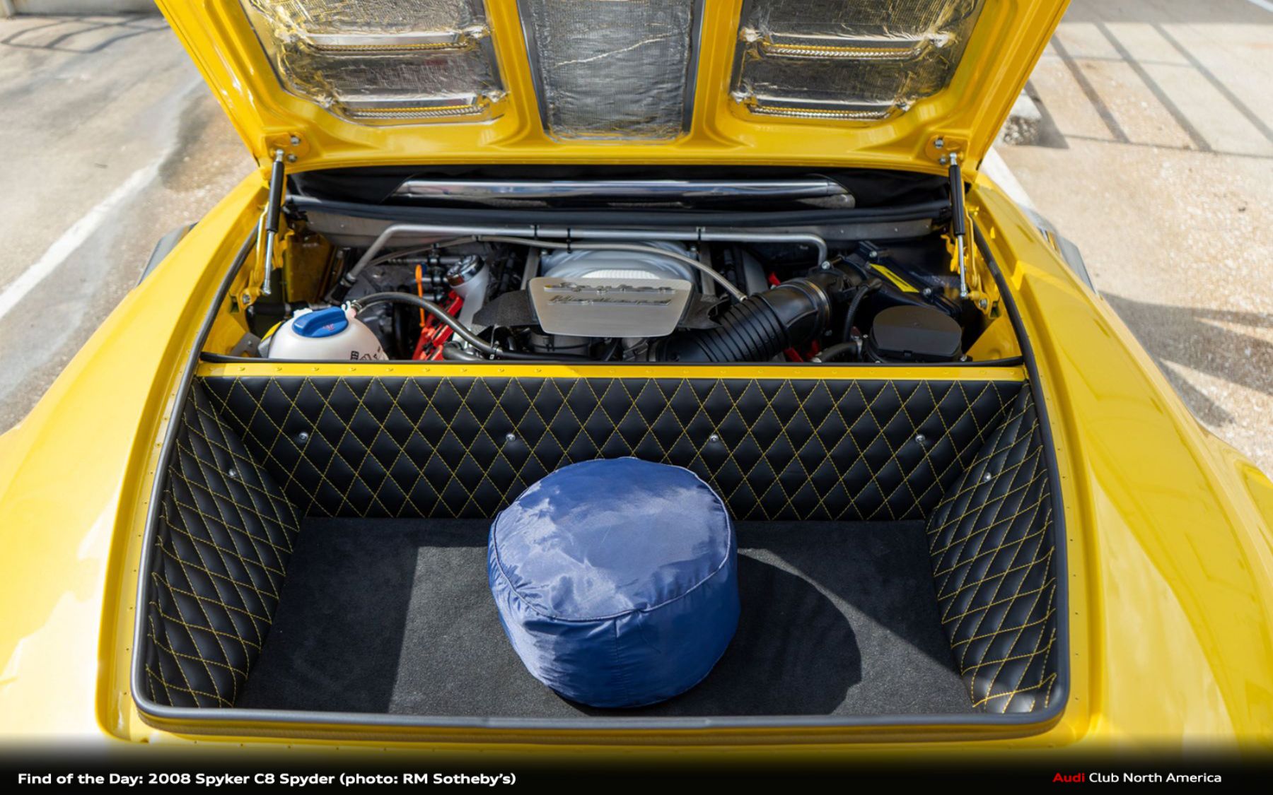One of just 121 constructed, this bespoke Dutch supercar sports several desirable factory options. Showing just over 800 miles at time of cataloguing, it is one of only four examples finished in striking yellow over optional quilted black leather with yellow stitching. Furthering its unique specification, this Spyker Spyder is one of 15 examples factory equipped with the unusual periscope rear view mirror. Other factory options include 19-inch, “aeroblade” alloy wheels, four dashboard air-conditioning vents, side-window reinforcement bars, and a Spyker-branded oil filler cap. The car has been fitted with a desirable four-spoke Spyker propeller steering wheel, purchased from Spyker specialist Jasper den Dopper. The original steering wheel accompanies the sale, along with a service invoice detailing recent overhaul of the air-conditioning system at a cost of almost $2,000. From its quilted leather to its exposed shifter mechanism, billet machined pedal box, and optional features, this C8 Spyder exudes absolute precision.